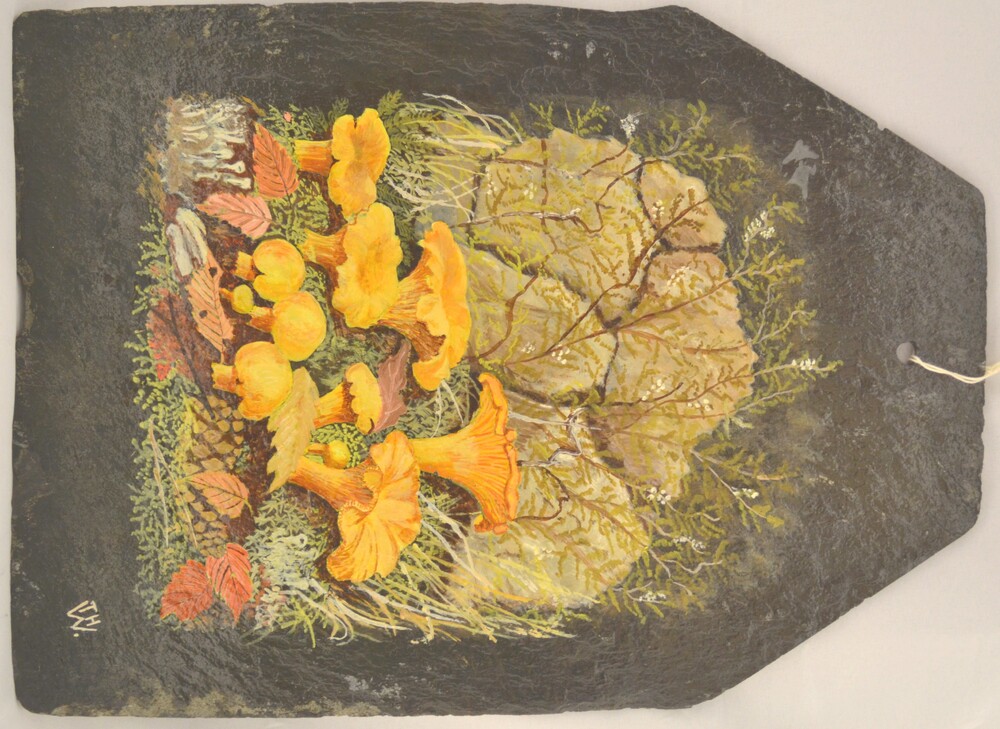 Wandbord van lei met de afbeelding van paddenstoelen...