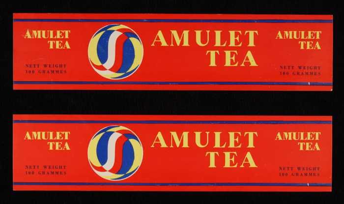 Twee rode, papieren labels VAN NELLE AMULET THEE, 10...