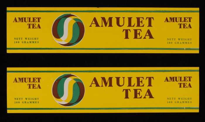 Twee zwarte, papieren labels VAN NELLE AMULET THEE, ...