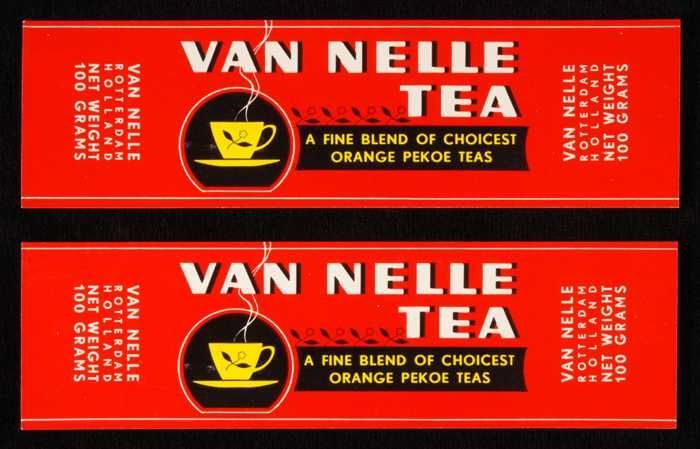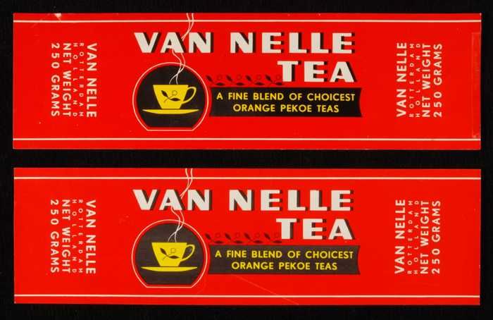 Twee rode, papieren labels VAN NELLE'S CEYLON THEE, ...