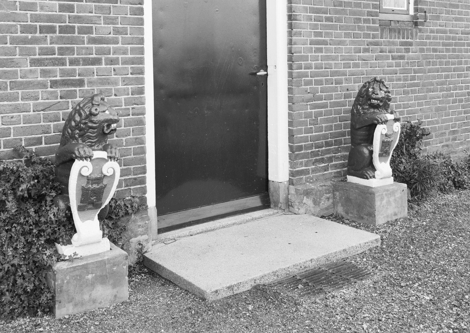 Twee arduinstenen beelden van leeuwen, die de toegan...