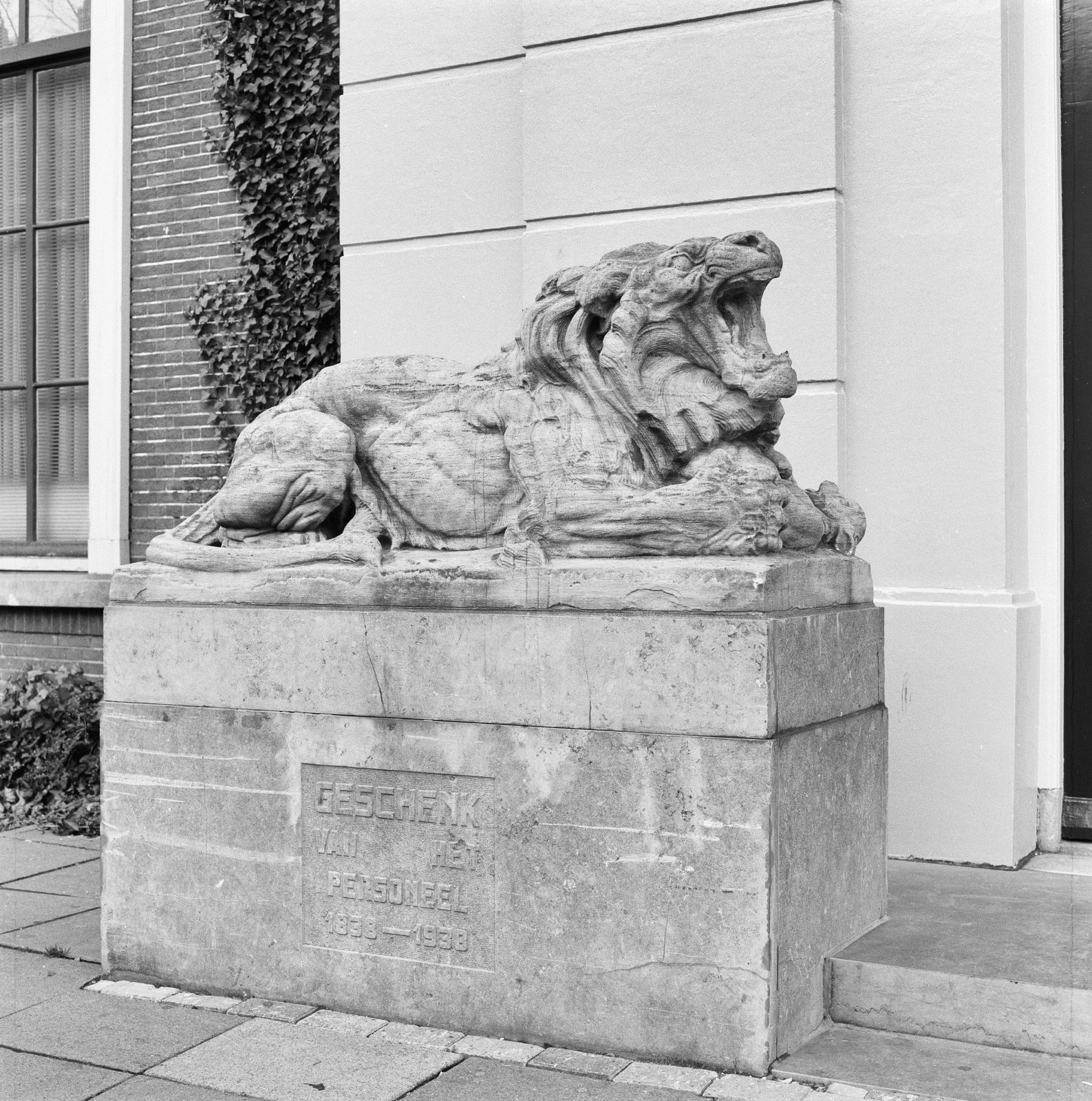 Beeld van een leeuw met prooi, links naast de ingang...