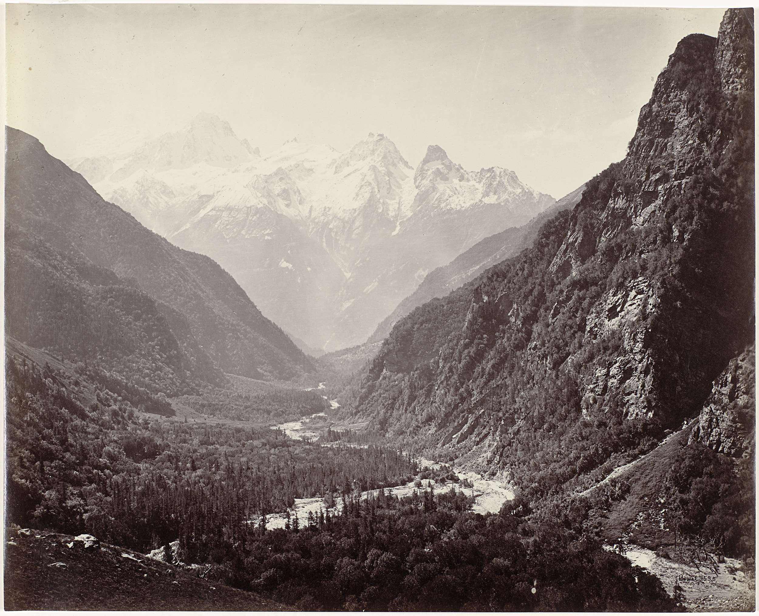 Valley view and the Srikantha peak in the Himalayas,...
