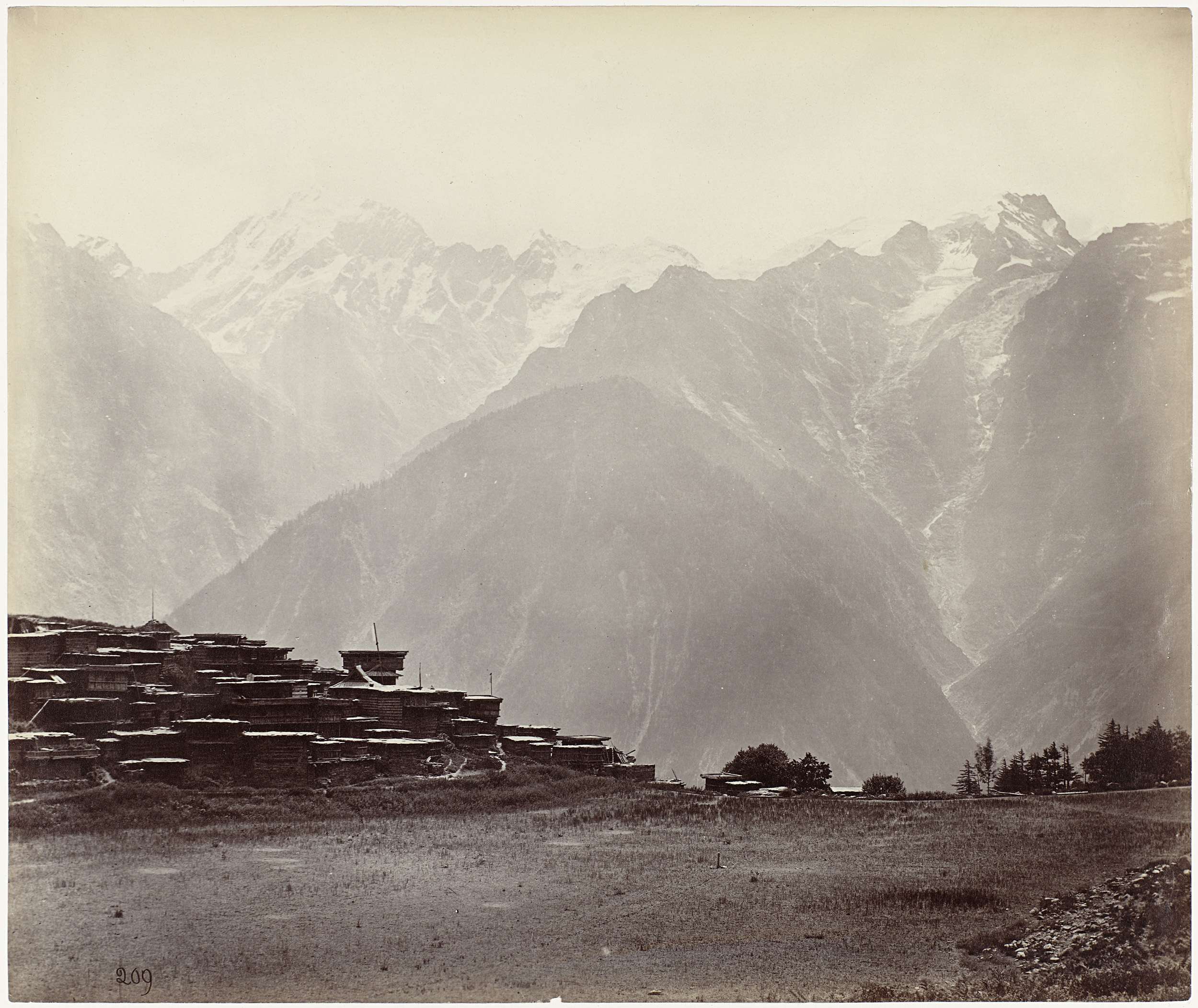 View of the Chini village, with the Himalayas at the...
