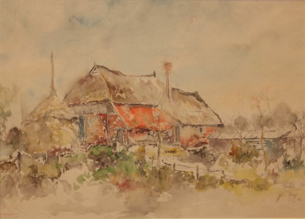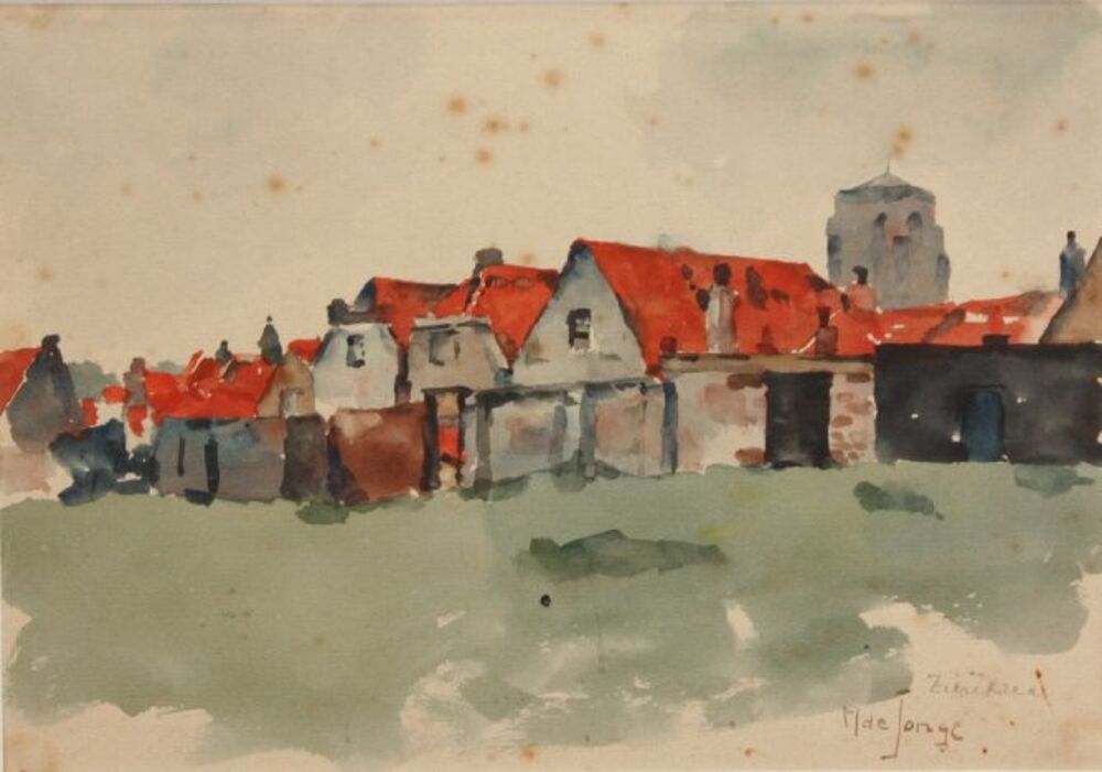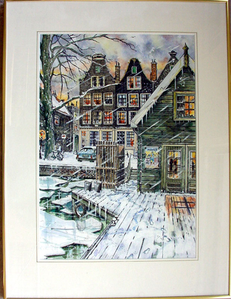 Aquarel voorstellende gebouwen met een gracht ervoor...
