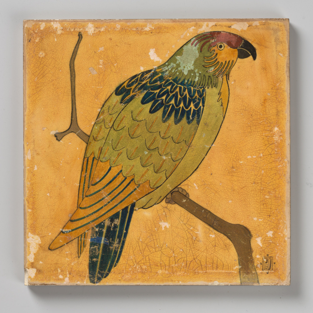 tegel van aardewerk in koudlak, voorstellende: papeg...