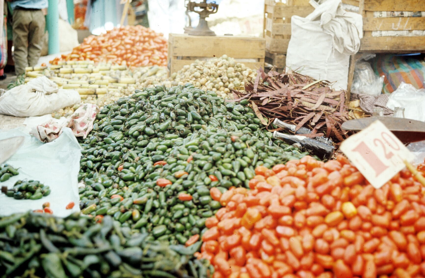 chiles (Spaanse pepers), knoflook en fruit op markt