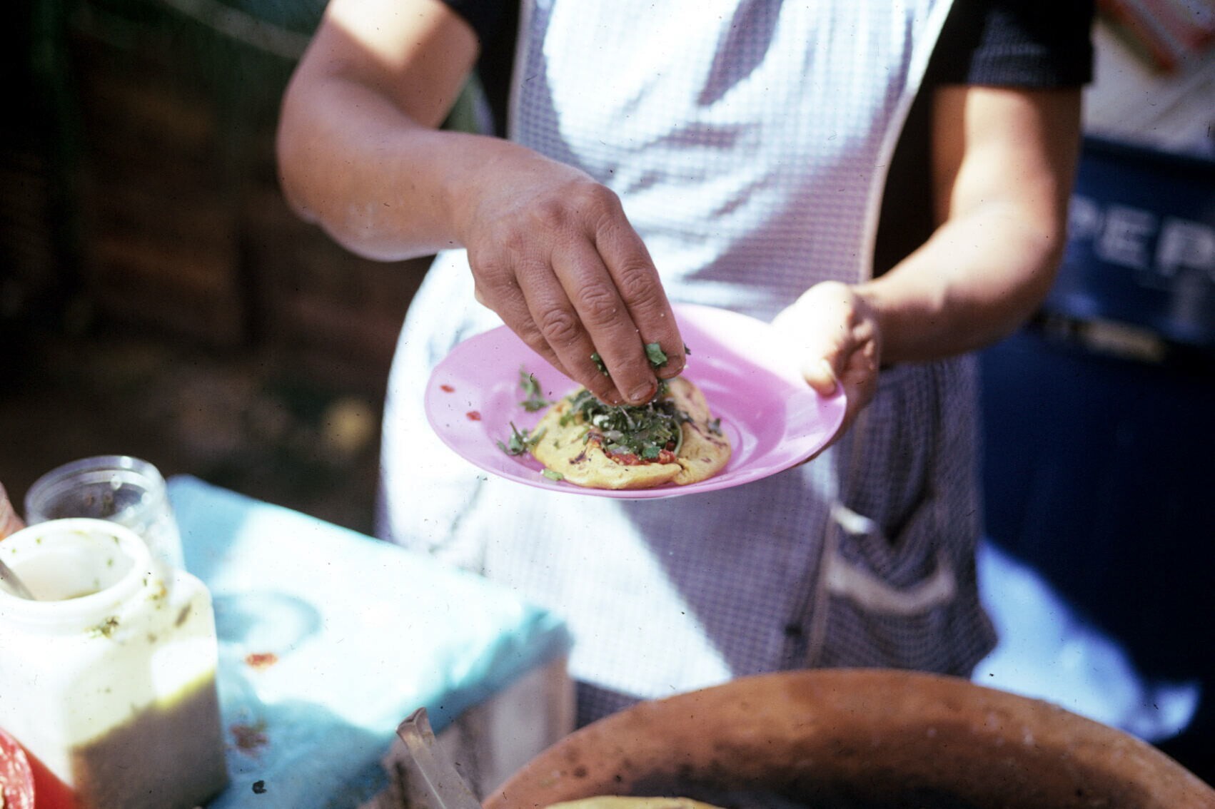 tortillaverkoopster, mole (saus) op tortilla's schep...