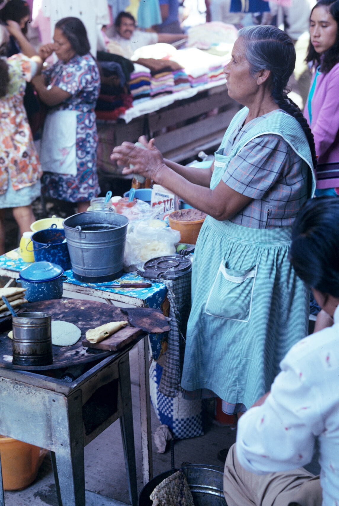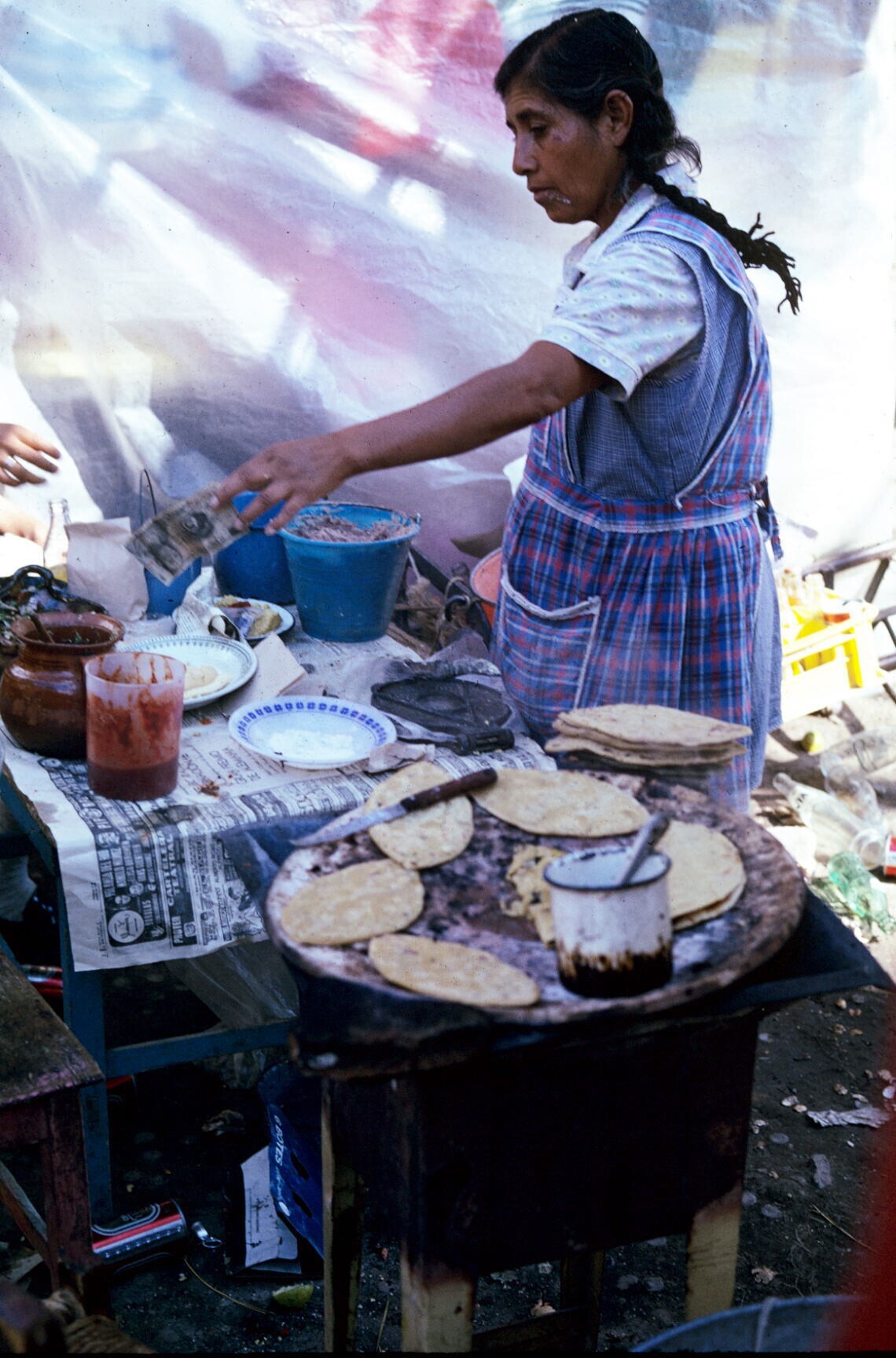 tortillaverkoopster in stalletje, met comal (bakplaat)