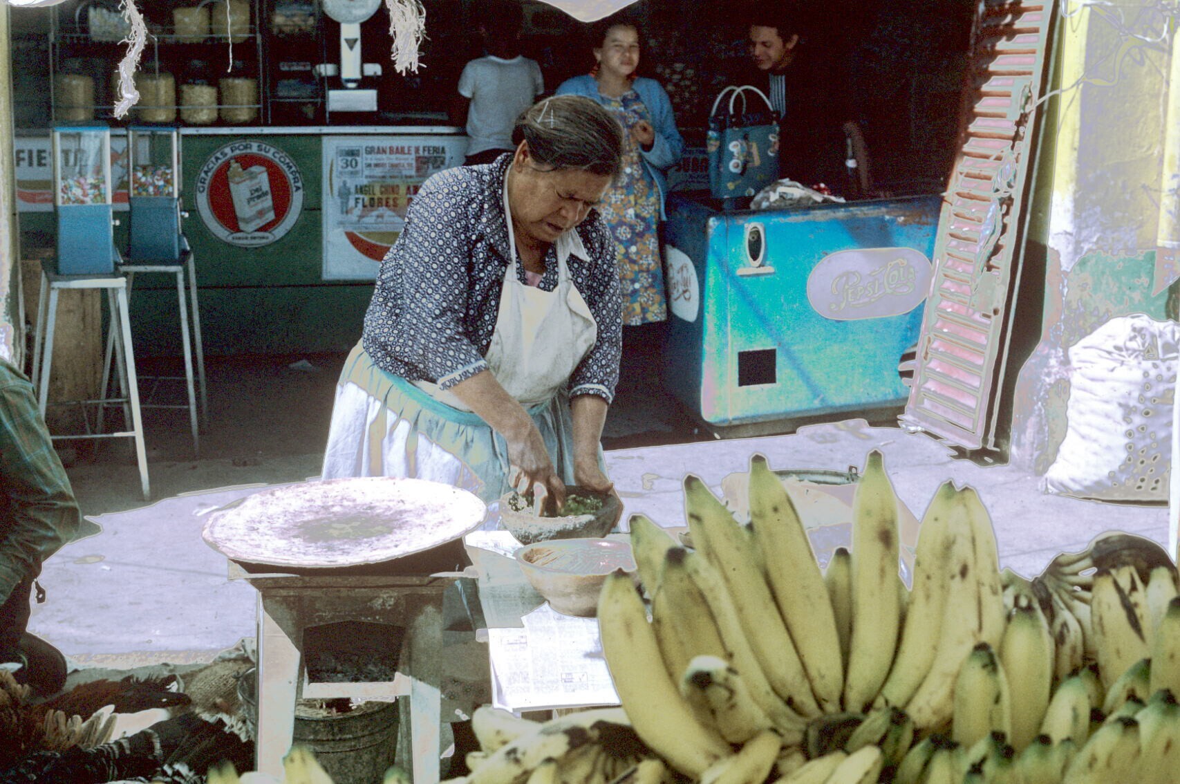 tortillaverkoopster, mole (saus) makend, op markt