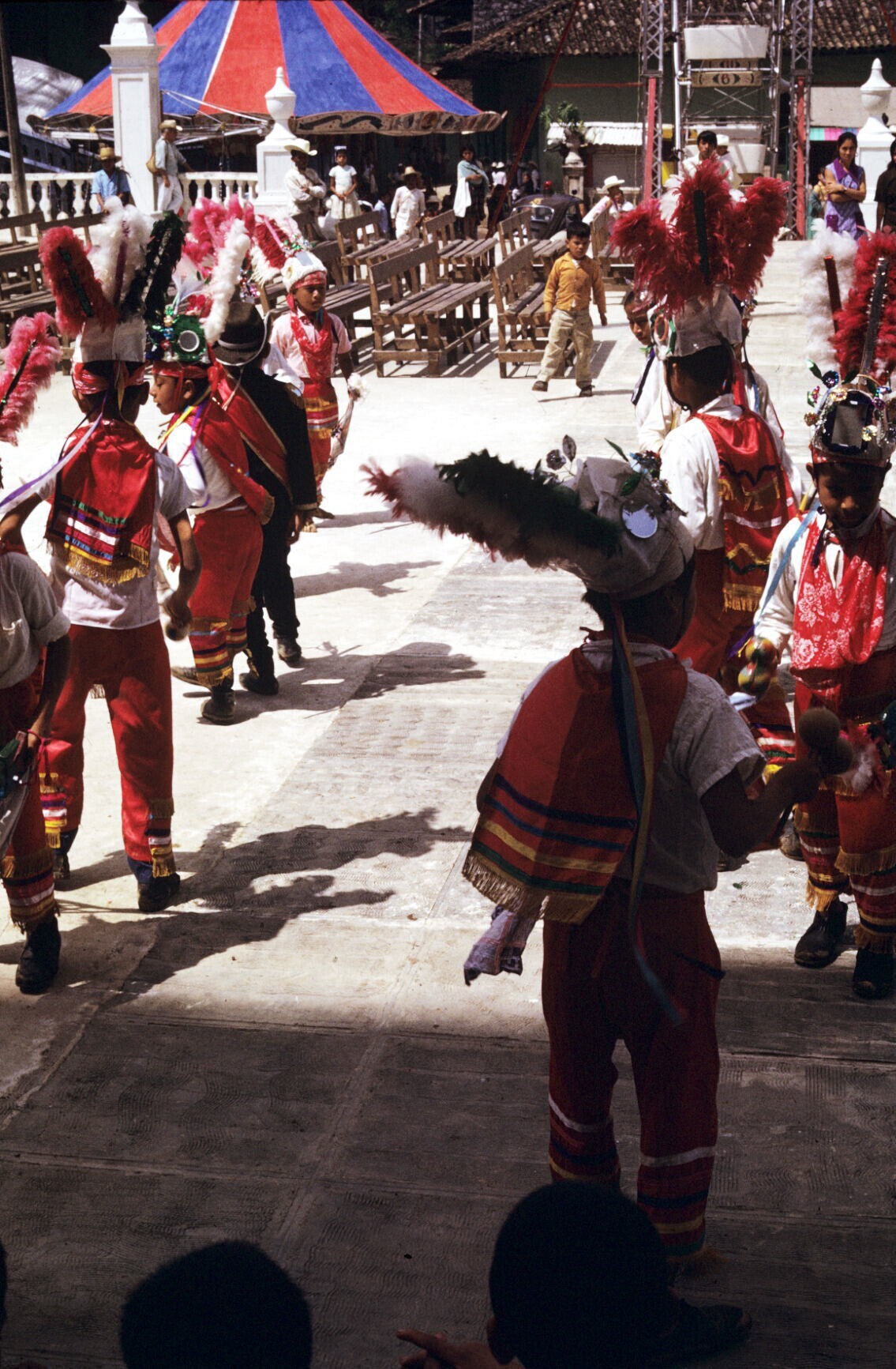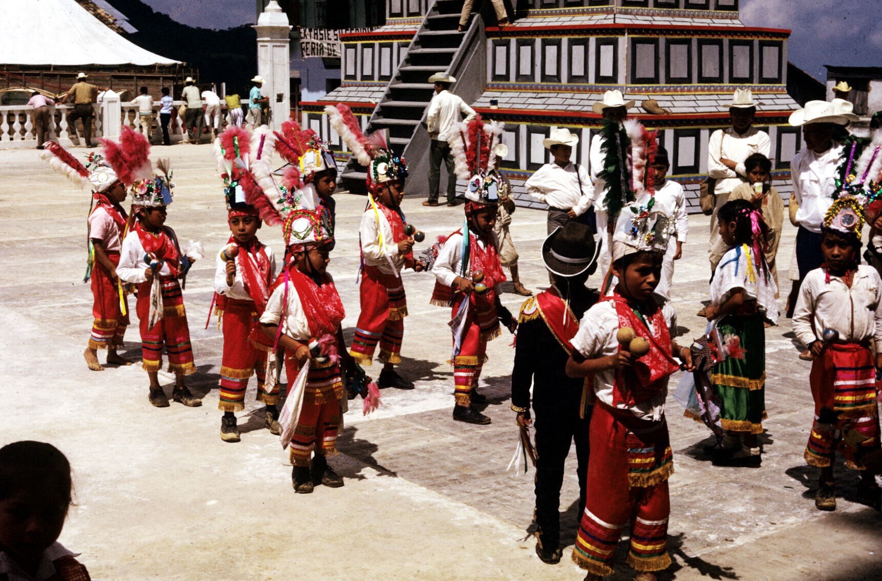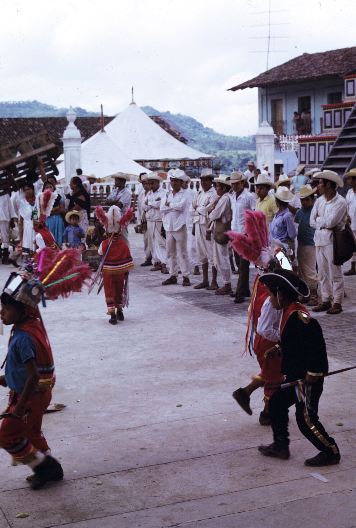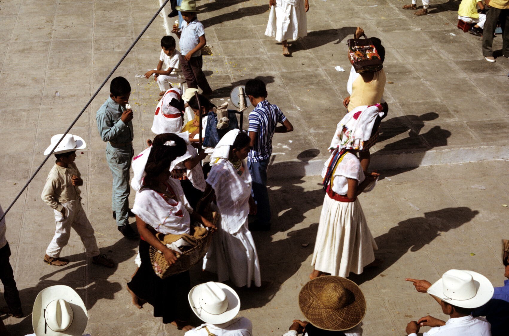 toeschouwers in feestkleding; NB kindje in "hua'cal"...