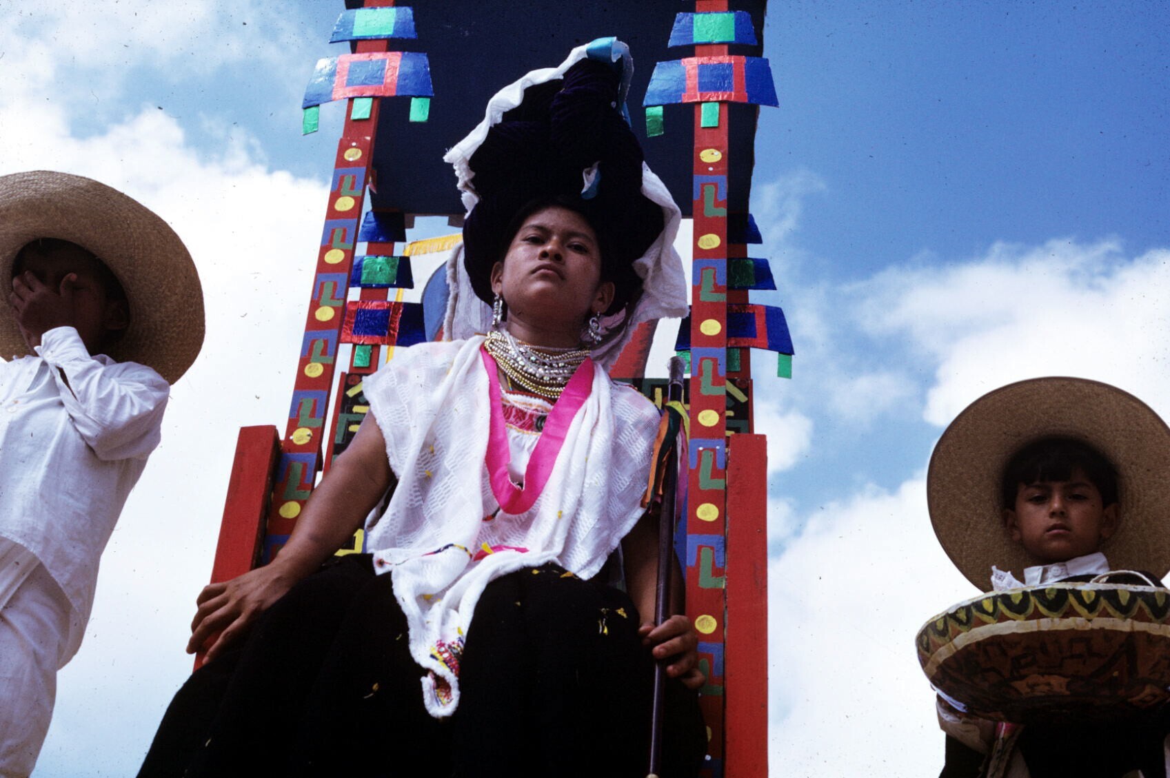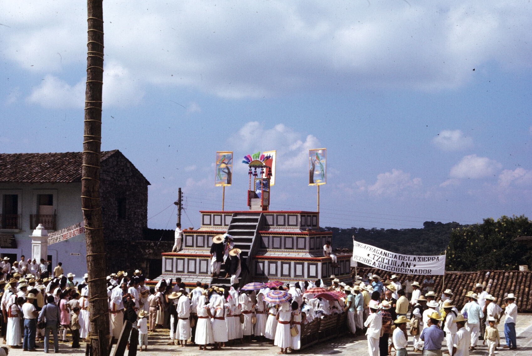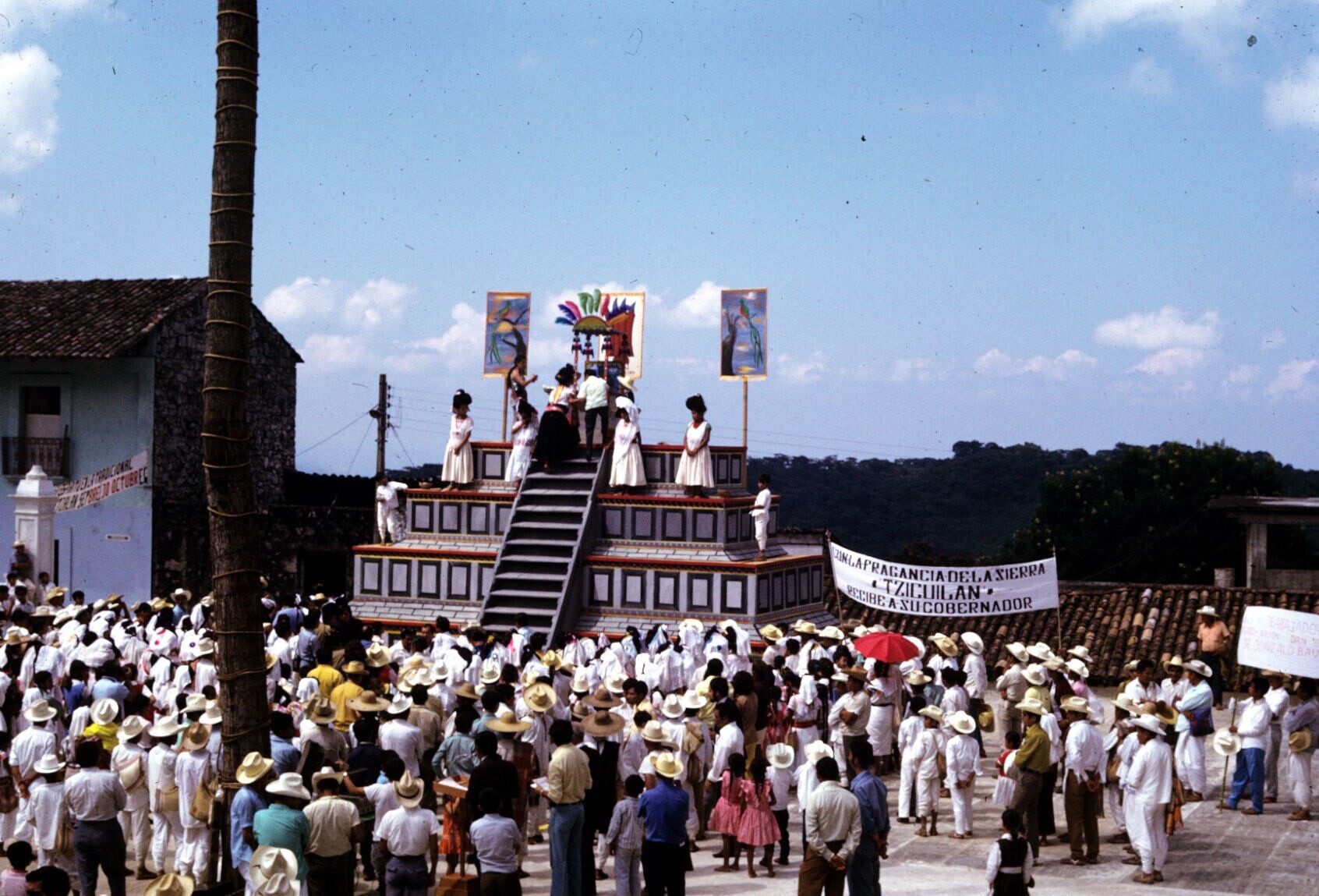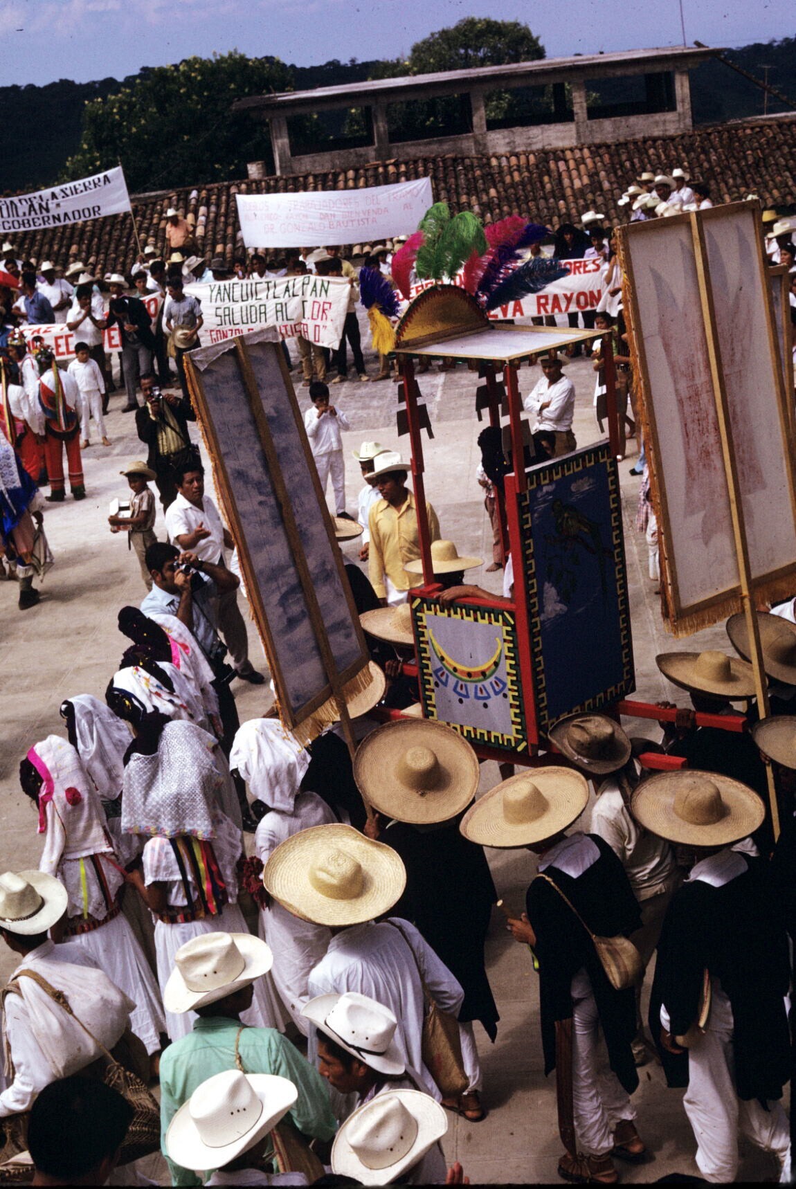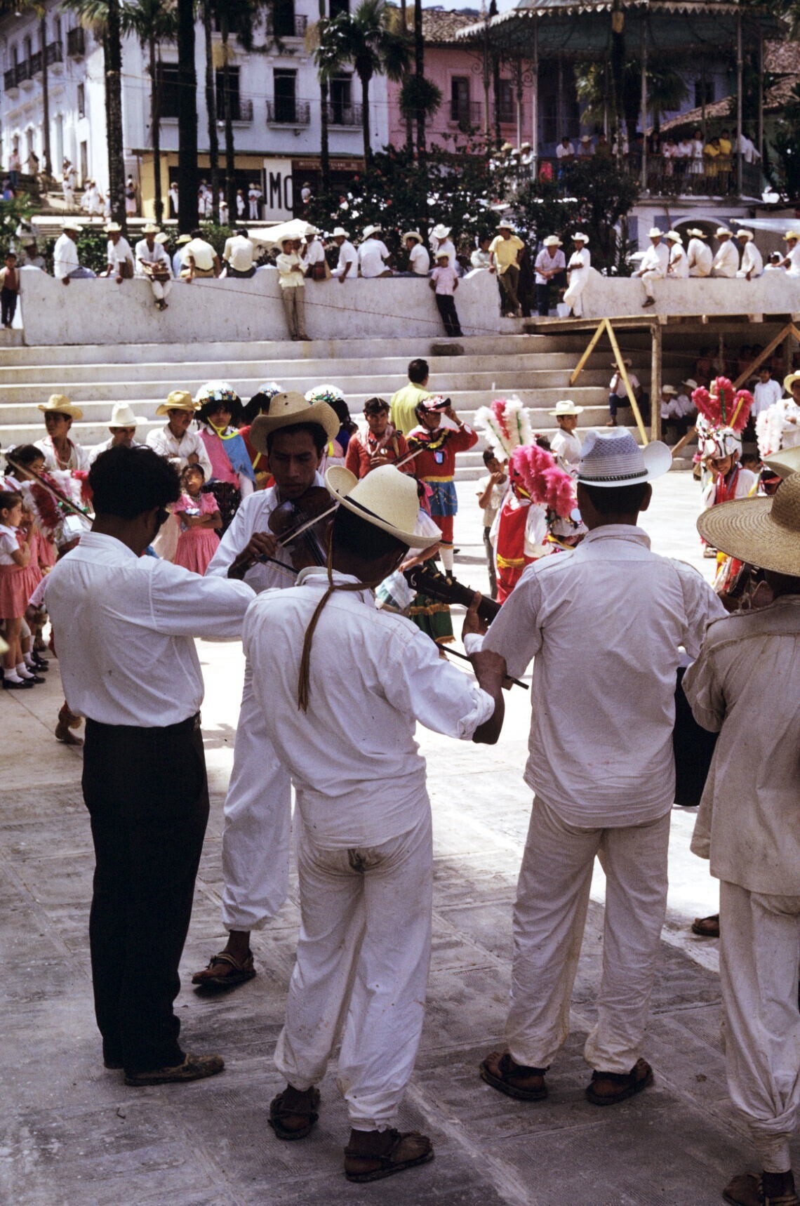 toeschouwers in feestkleding; NB kindje in "hua'cal"...