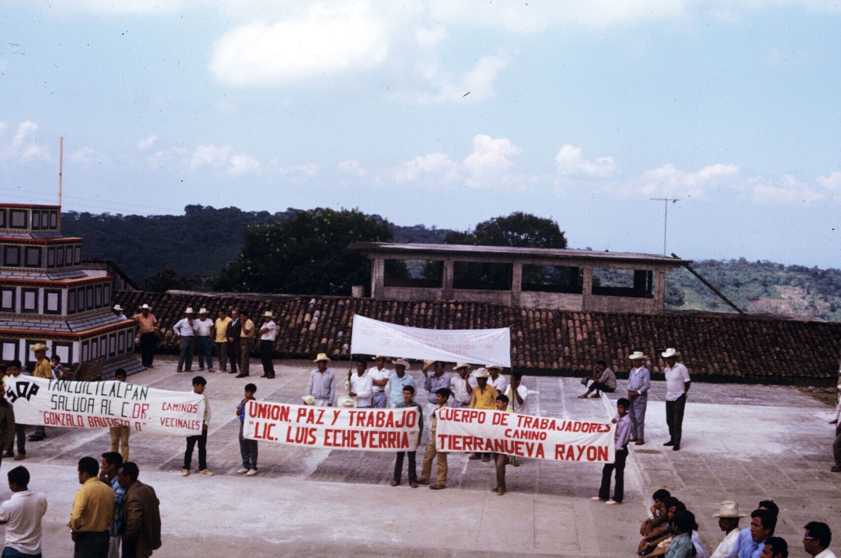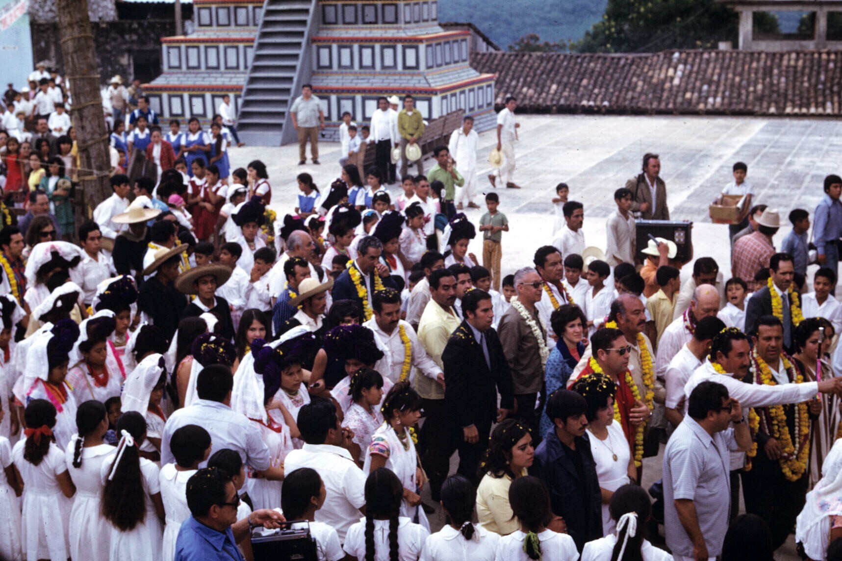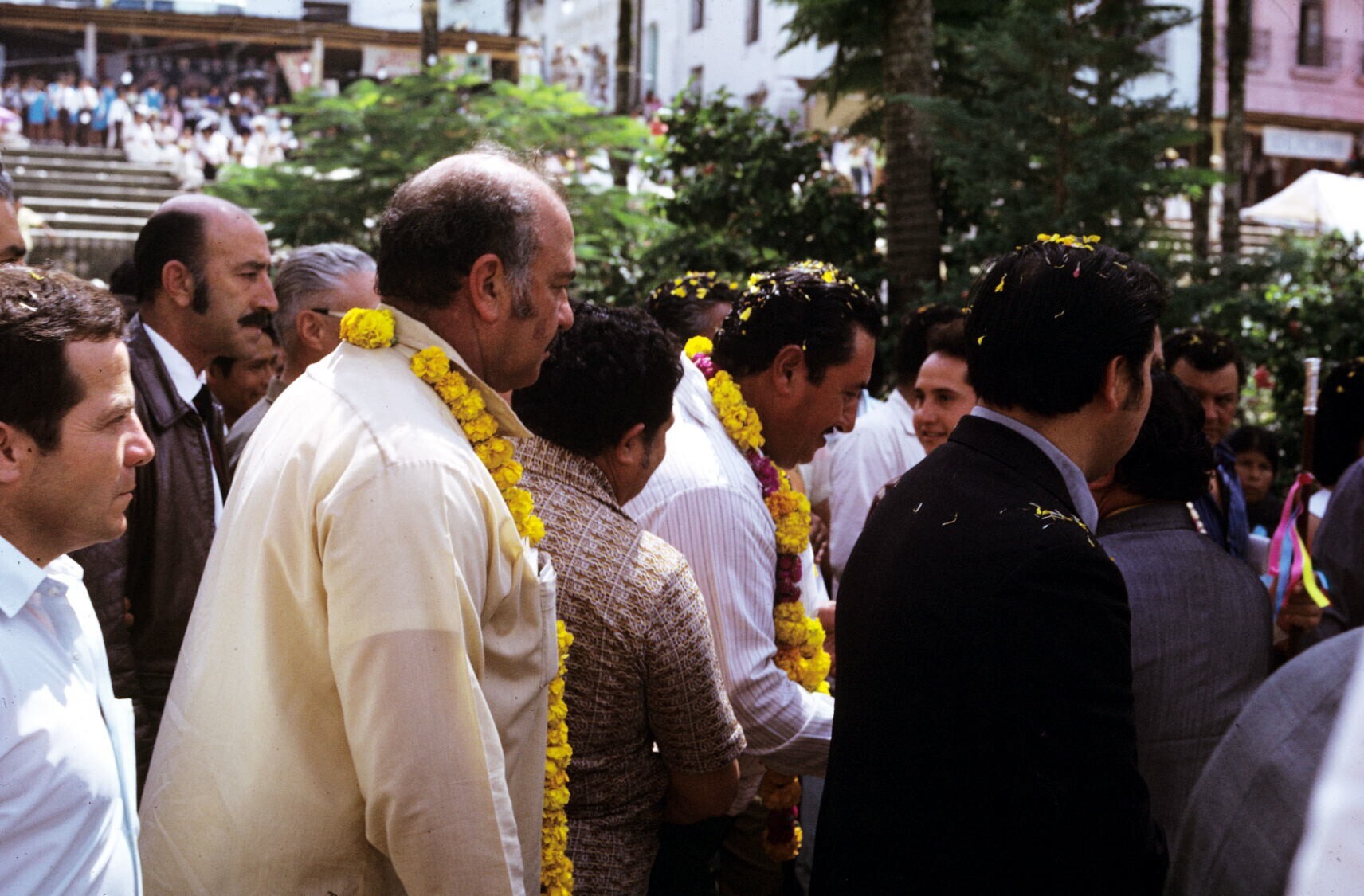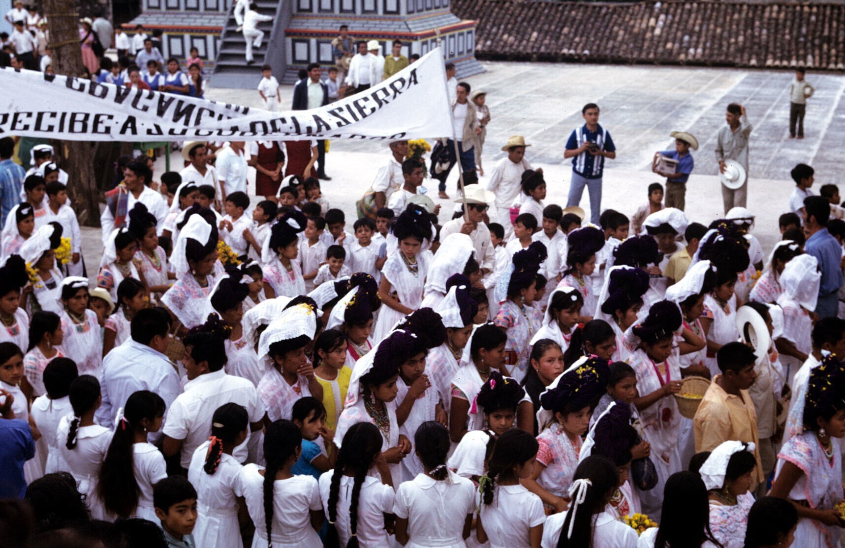 toeschouwers in feestkleding; NB kindje in "hua'cal"...