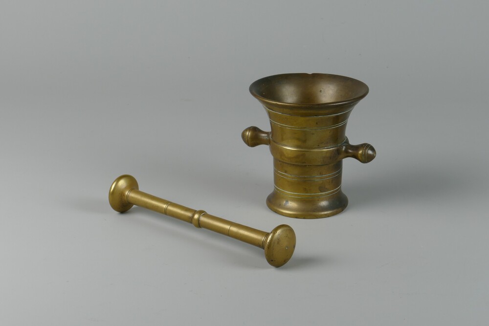 vijzel met stamper van messing, 19e eeuw