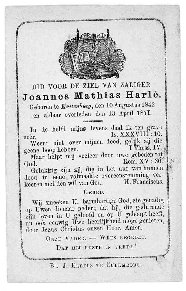 bidprent voor Joannes Mathias Harlé. Geboren te Cule...