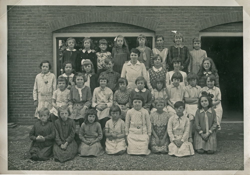 Zwart-wit foto van een klassenfoto van de meisjessch...