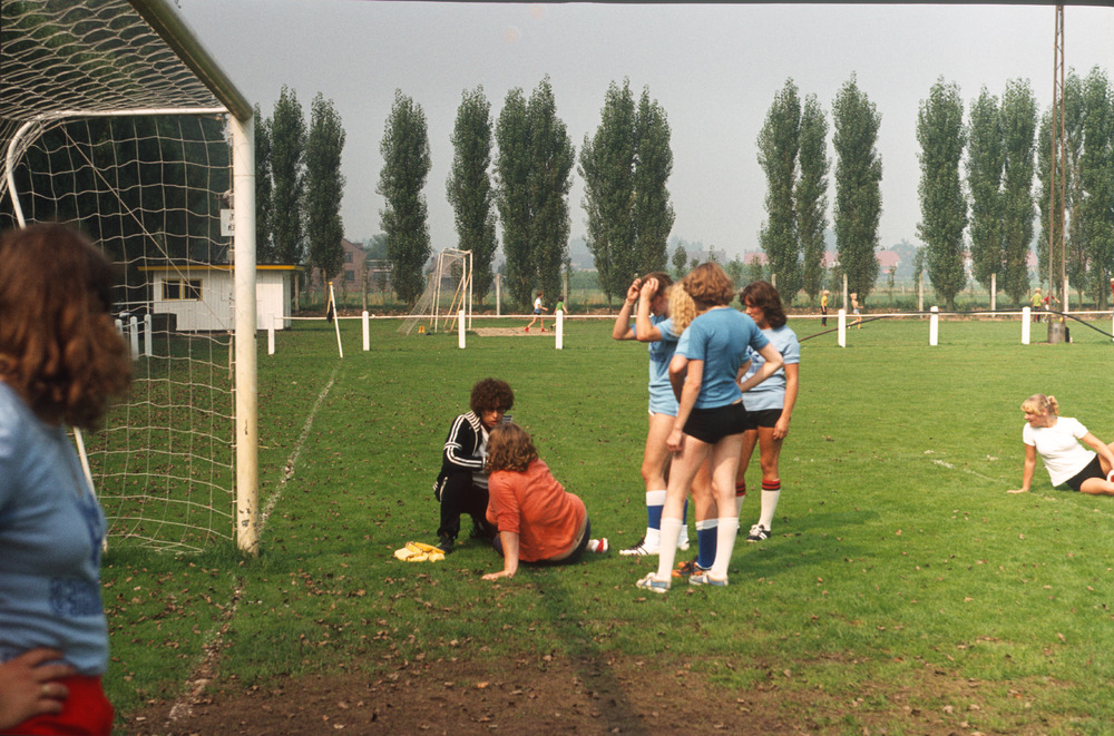 Kleurendia van zeven voetbalsters zittend en staand ...