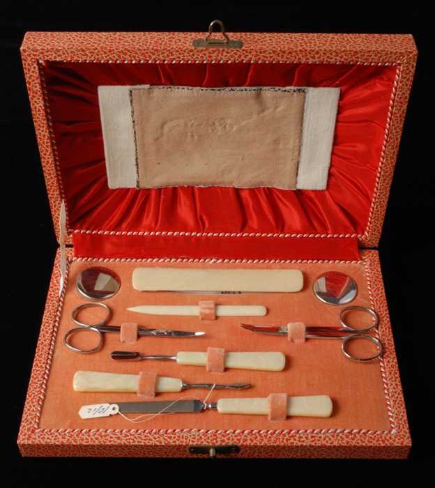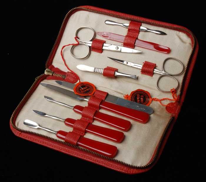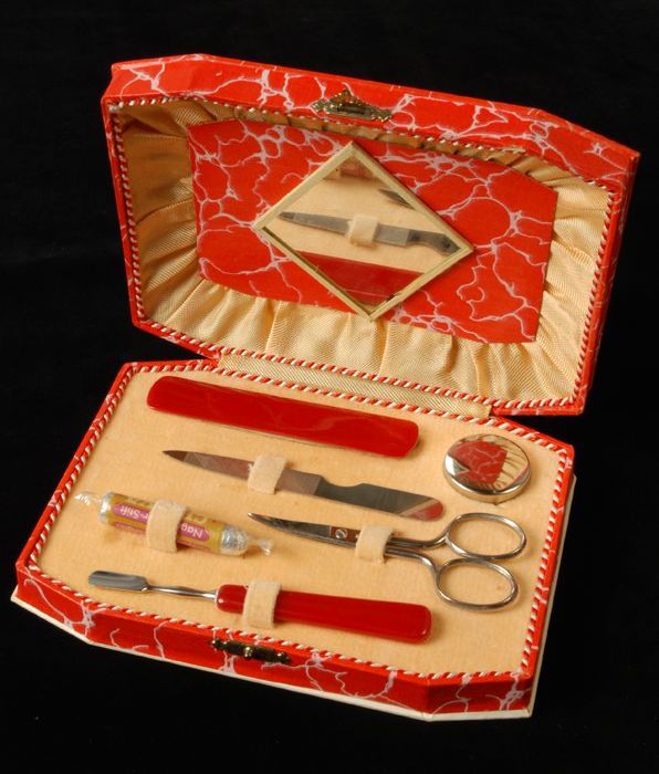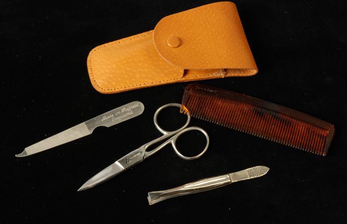 Vierdelige manicureset of toiletset in rechthoekig b...
