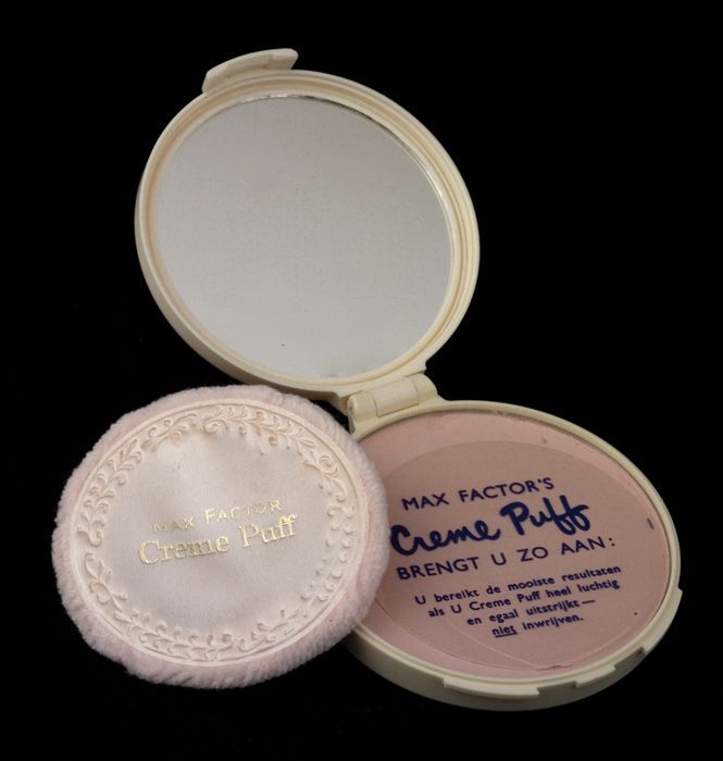 Ronde ivoorkleurige kunststof poederdoos met roze ge...