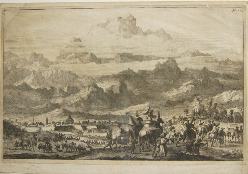 Stadsgezicht met ark van Noach. Kopergravure uit een...