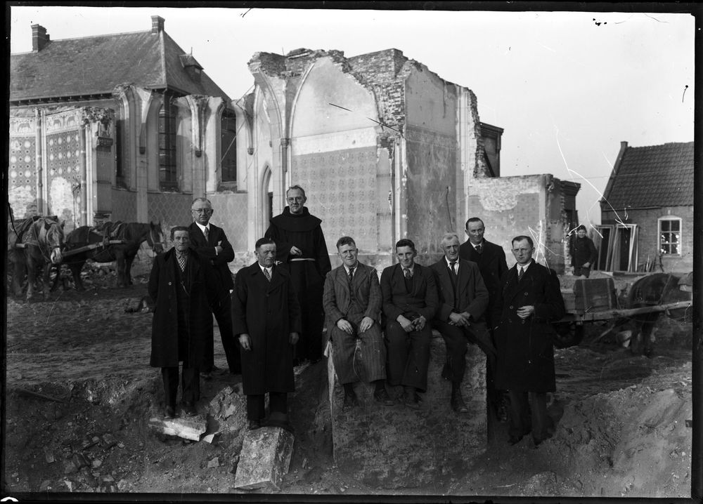 Groep mensen bij de verwoeste kerk in Ammerzoden.