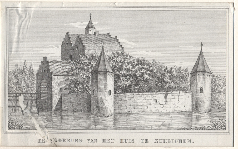 Gezicht op de voorburcht van het Huis te Zuilichem m...
