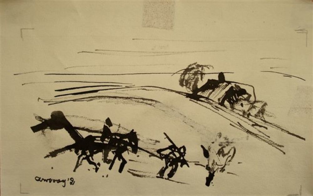 aquarel,arbeiders op het veld, Jan van Anrooy 1981