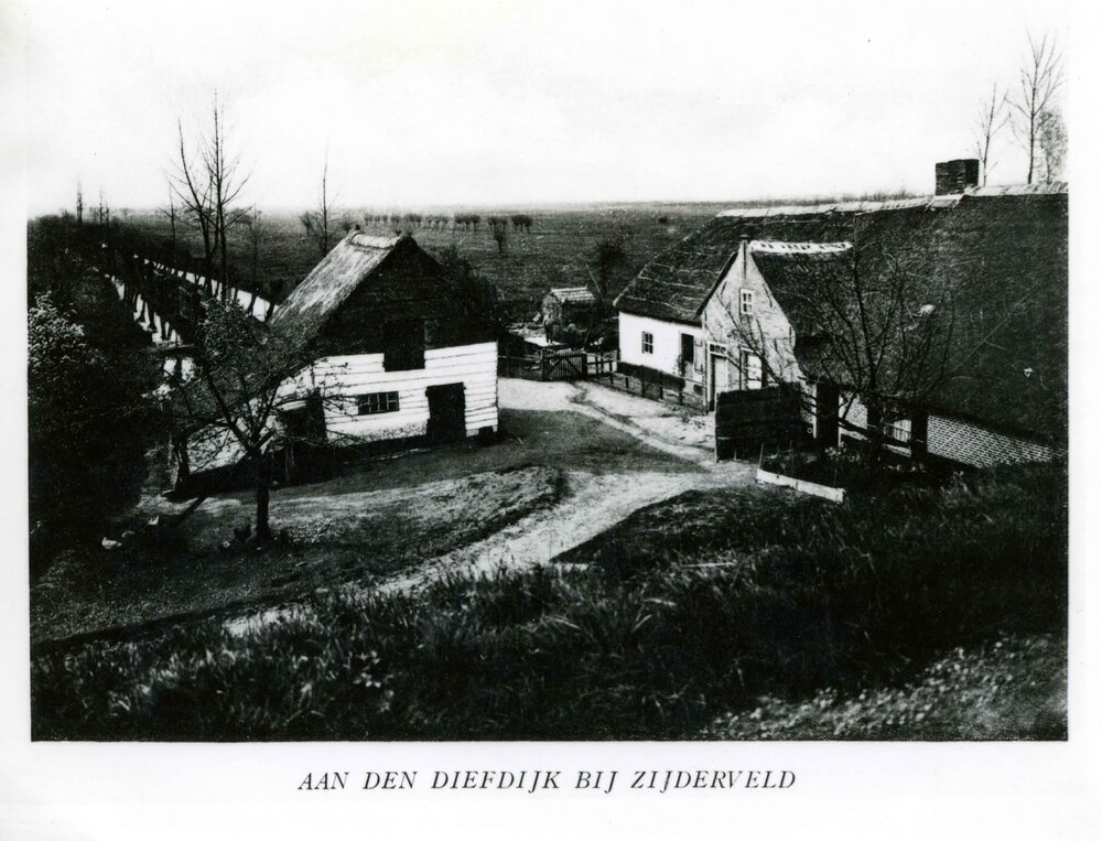 Foto, voorstellende een boerderij aan de Diefdijk om...