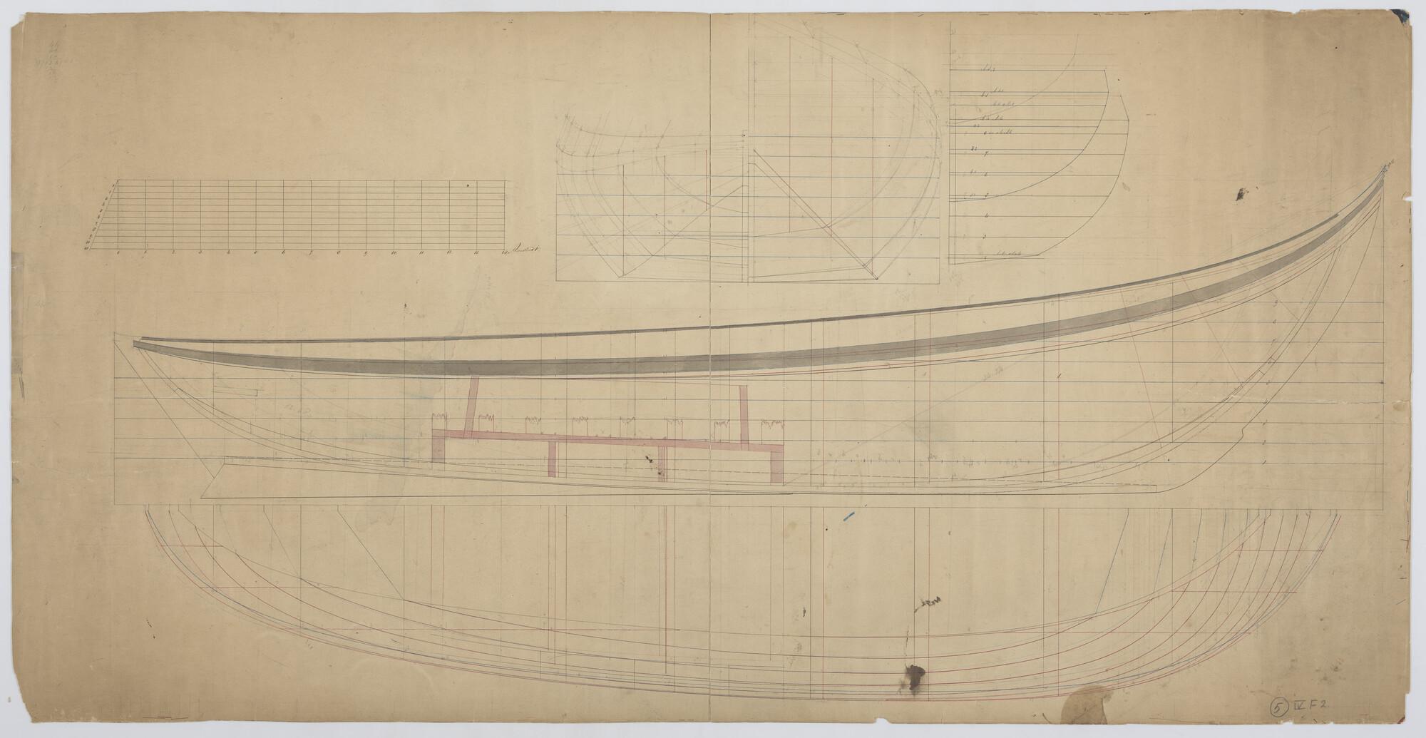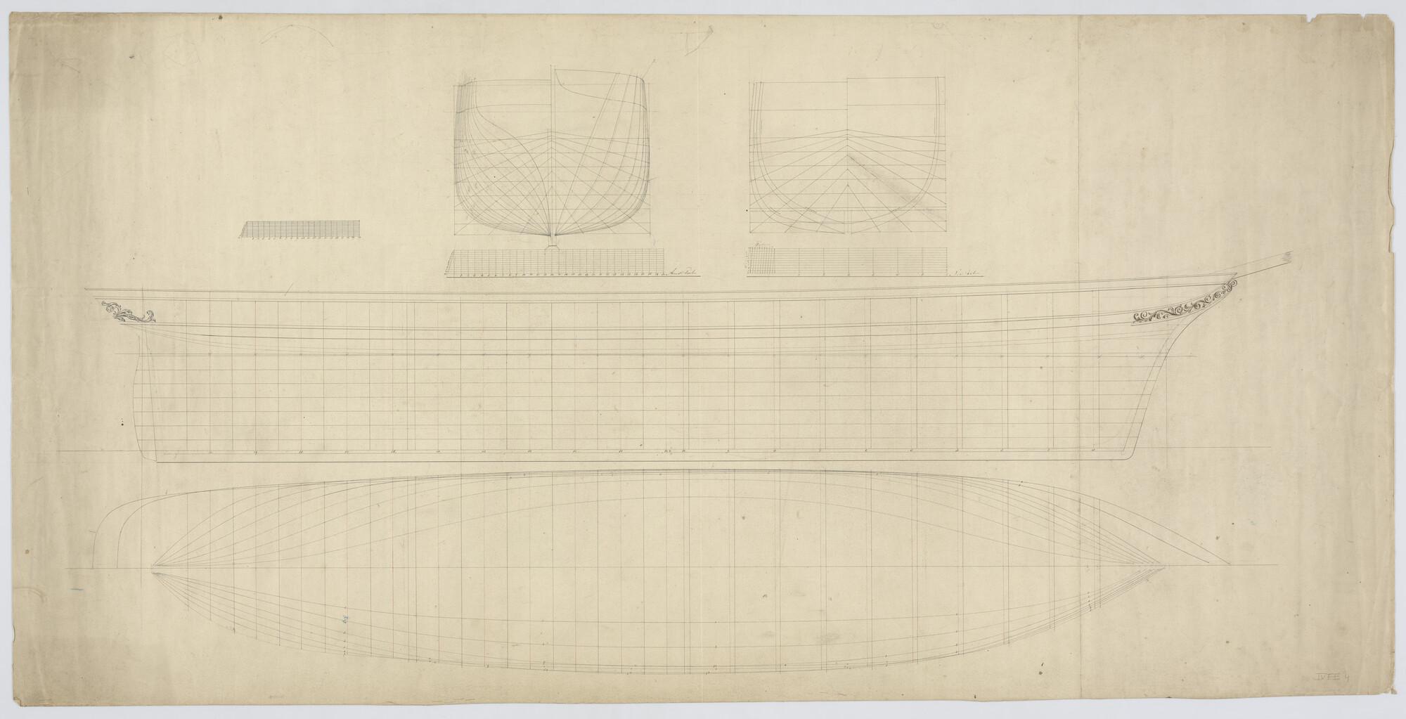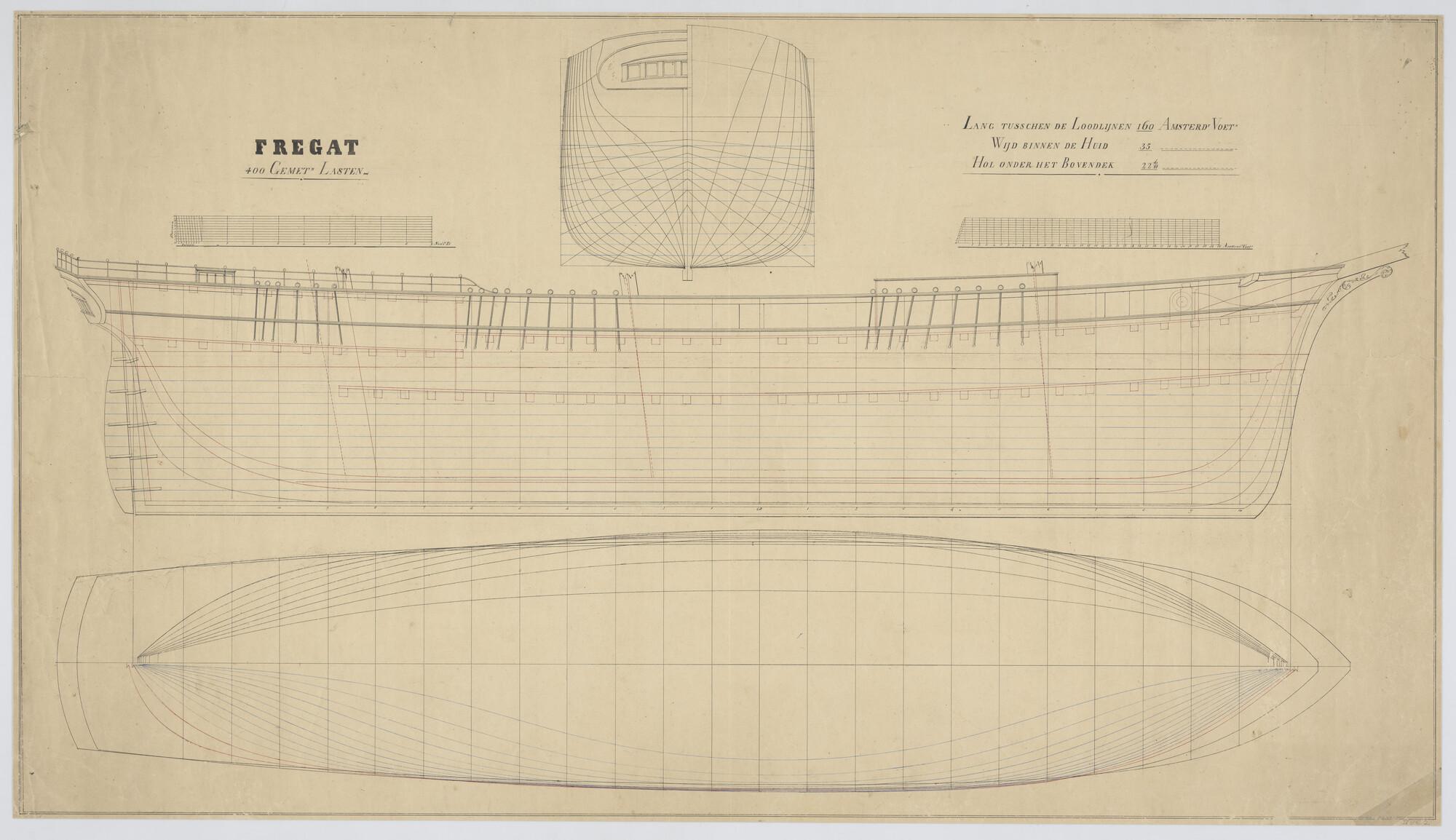 Zij-, voor- en achteraanzicht, senten en waterlijnen...