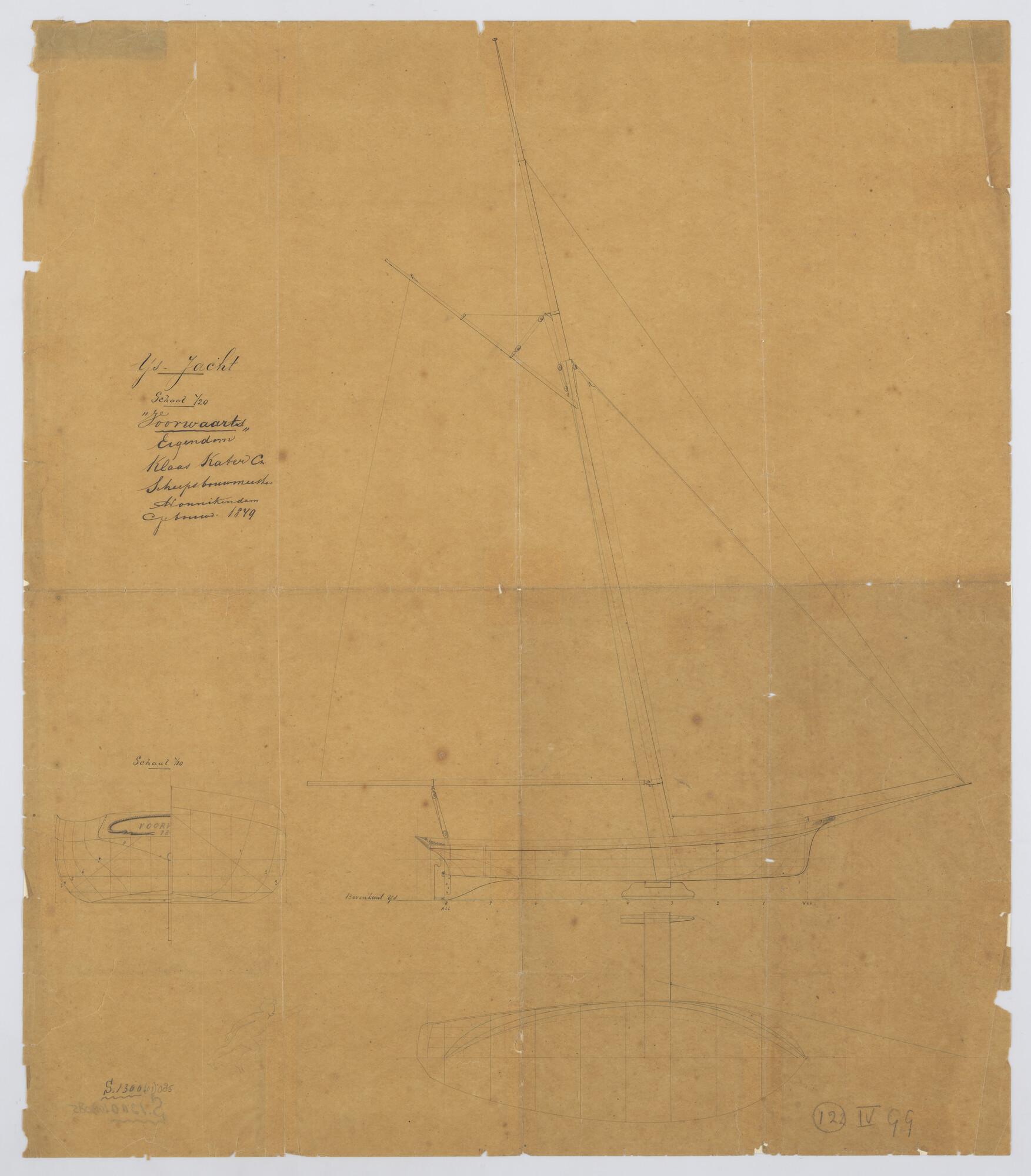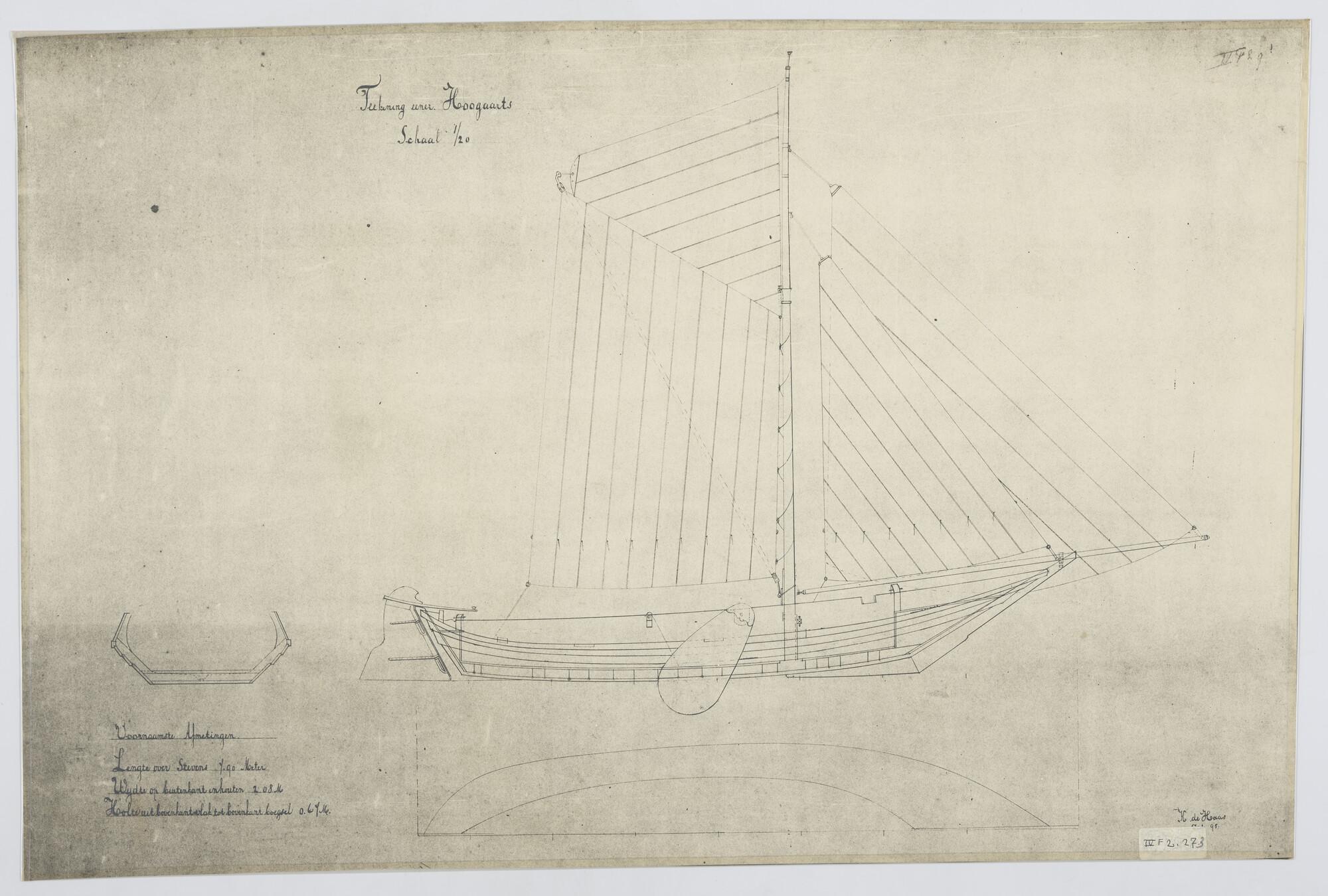 Lijnenplan, zijaanzicht met tuig van het ijsjacht Vo...