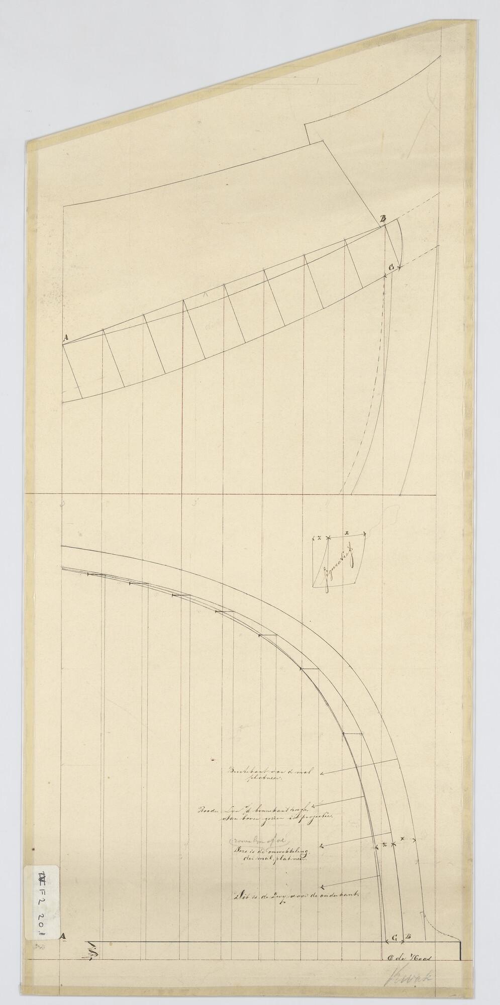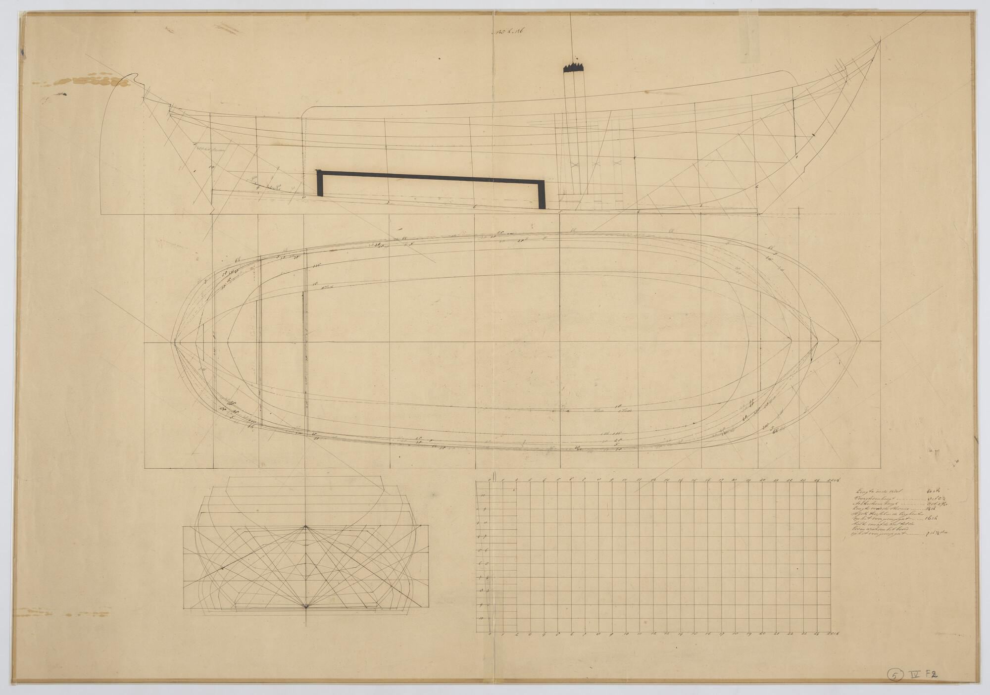 Zijaanzicht, spantenraam, waterlijnen van een Noordz...