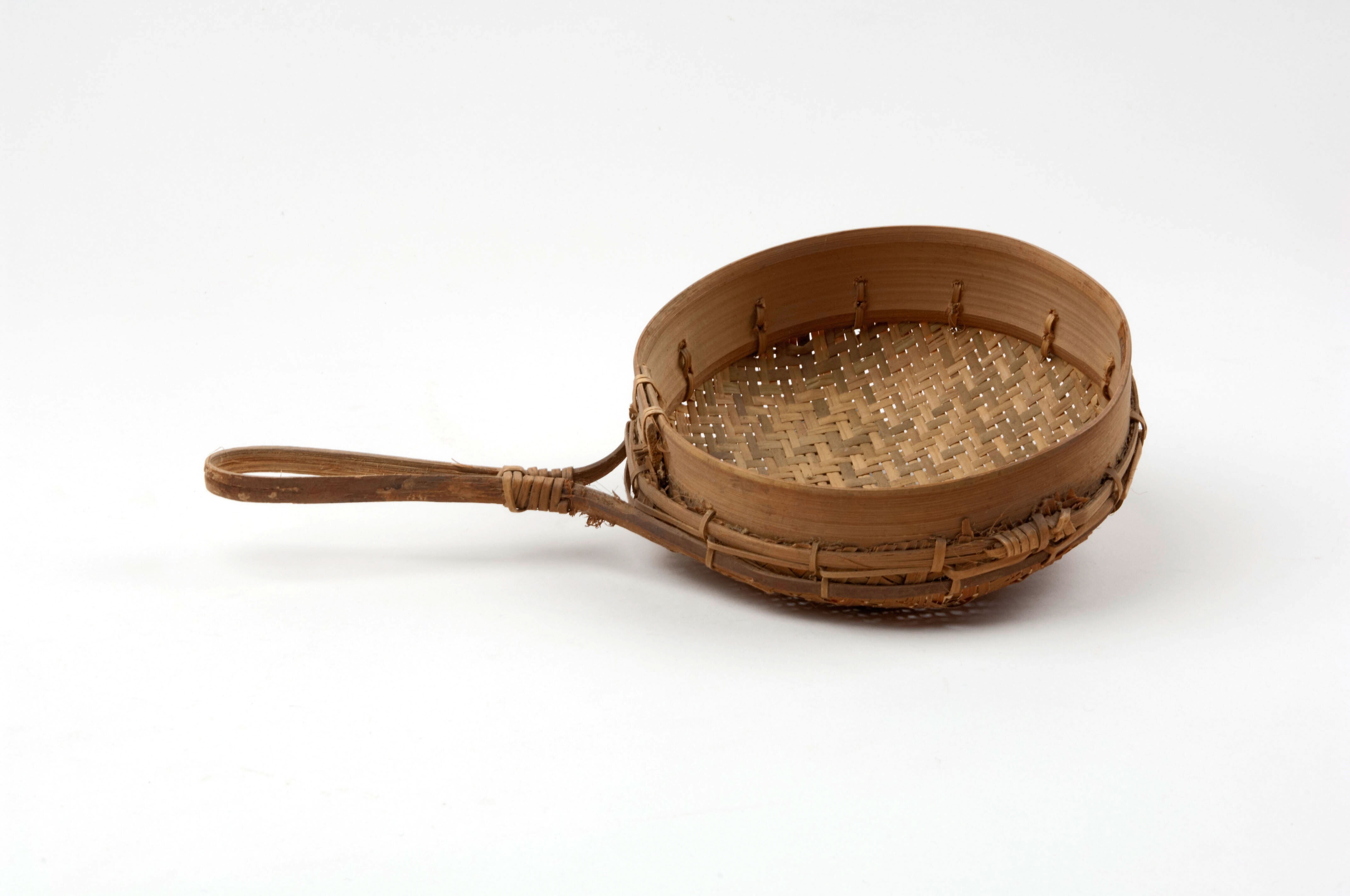 Kinderspeelgoed, zeefje van gevlochten bamboe, saring