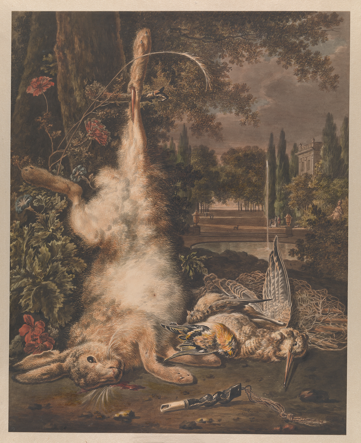 Een dode haas en enkele dode vogels, naar een schild...