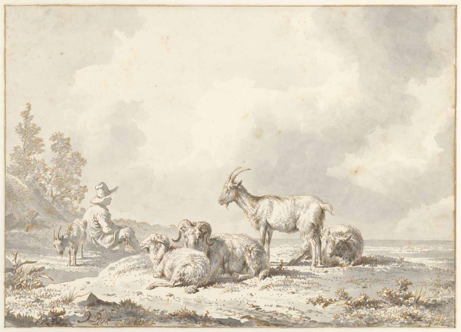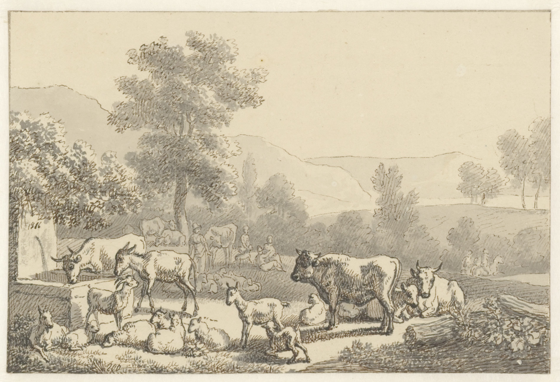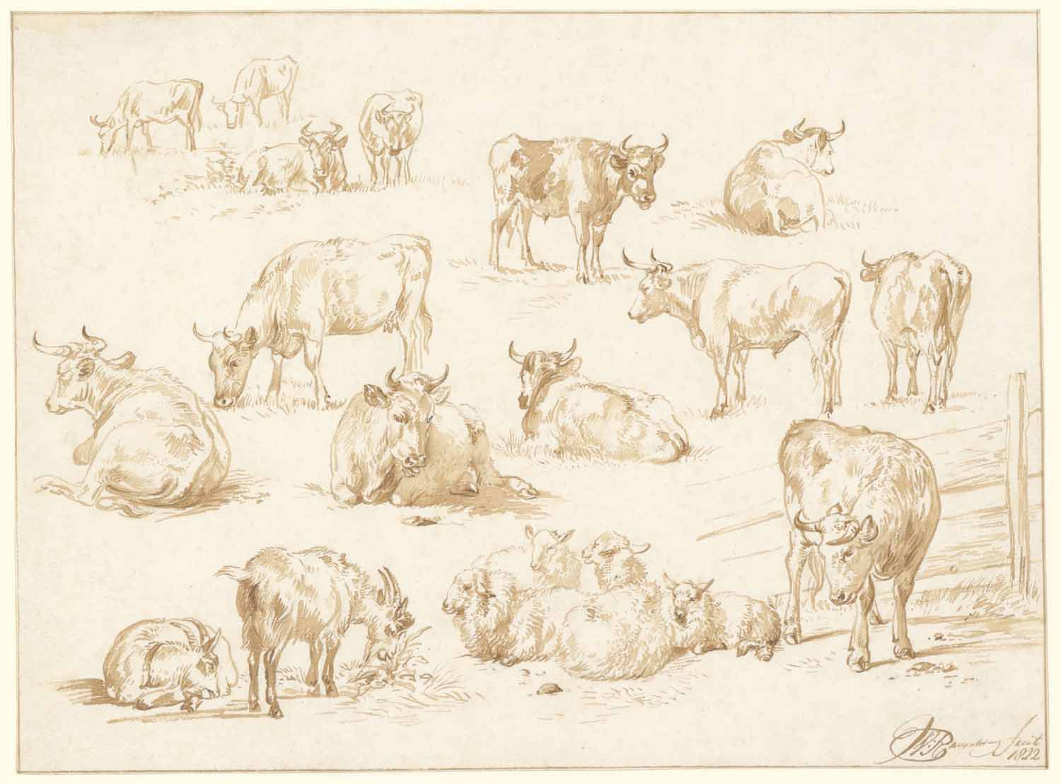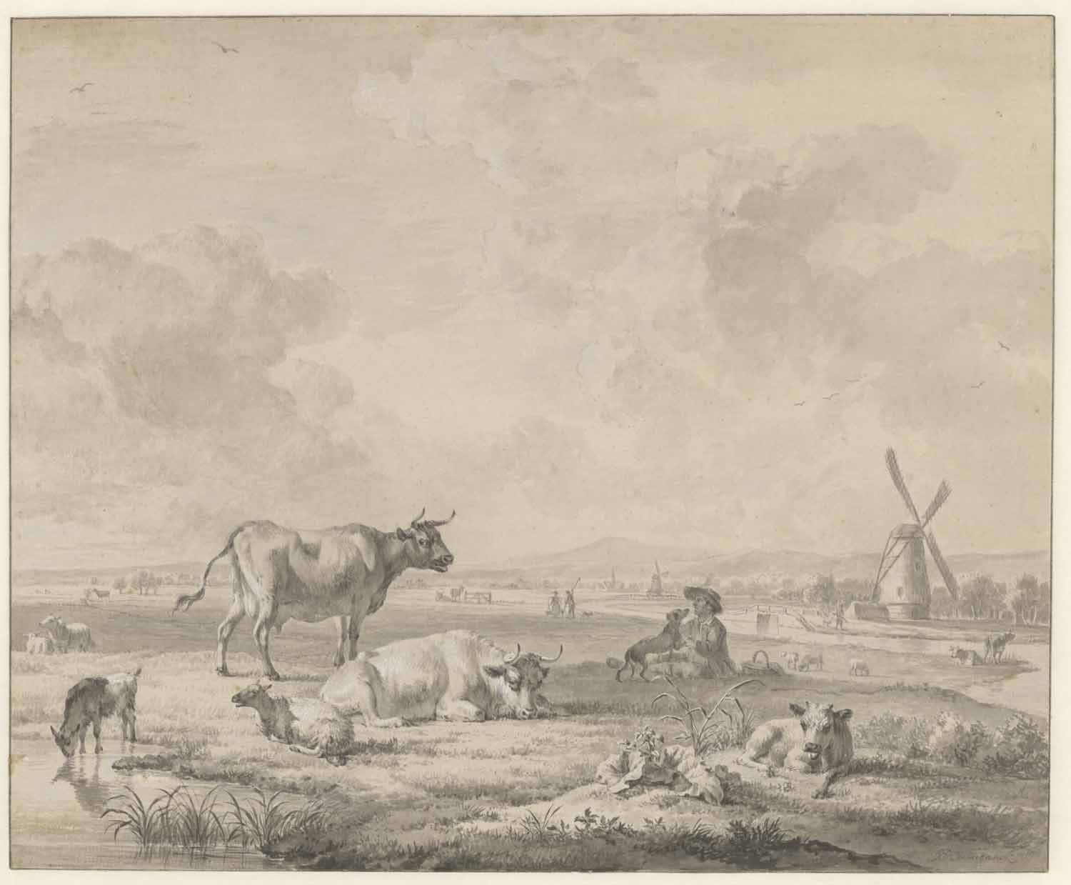 Eene weide met rundvee en schapen