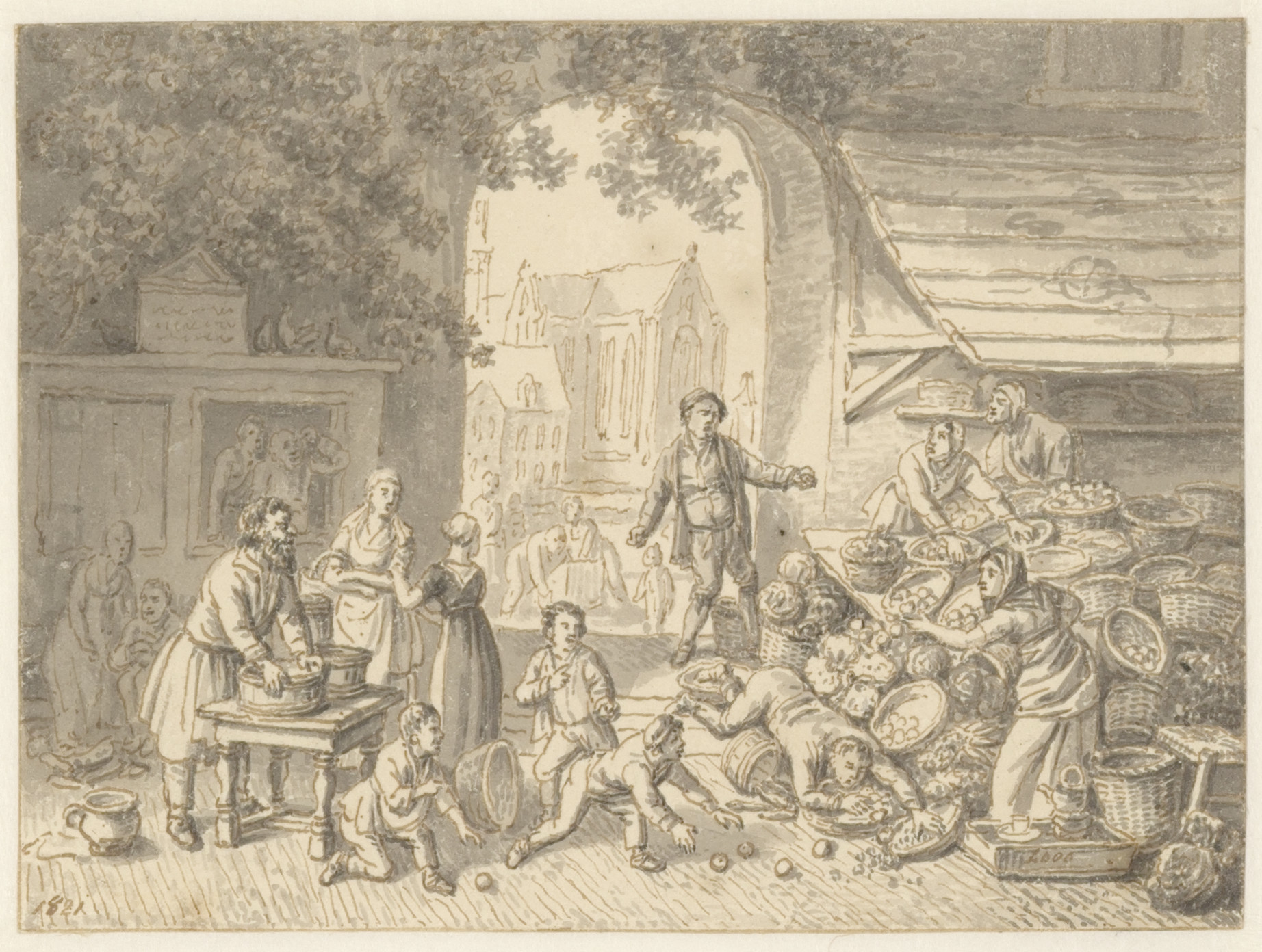 Een dronken boer welke in eene mand eijeren valt