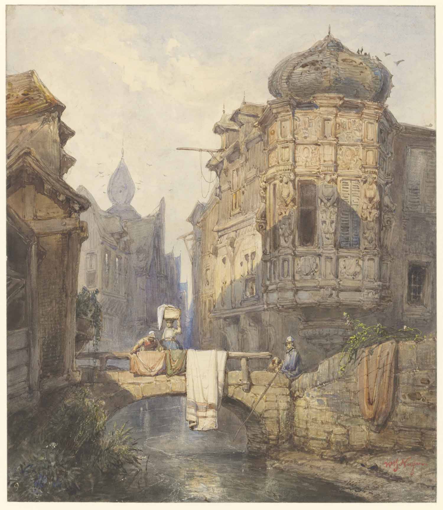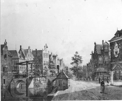 Eene brug over een water tussen eenige huizen