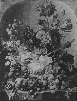 Eene rijke compositie van bloemen en vruchten