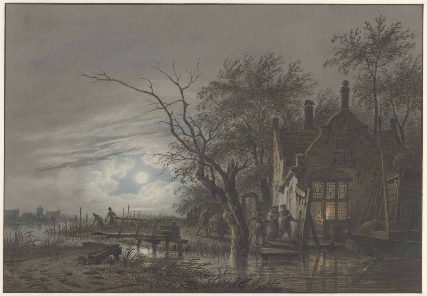 Eene boerenwoning en water bij maneschijn