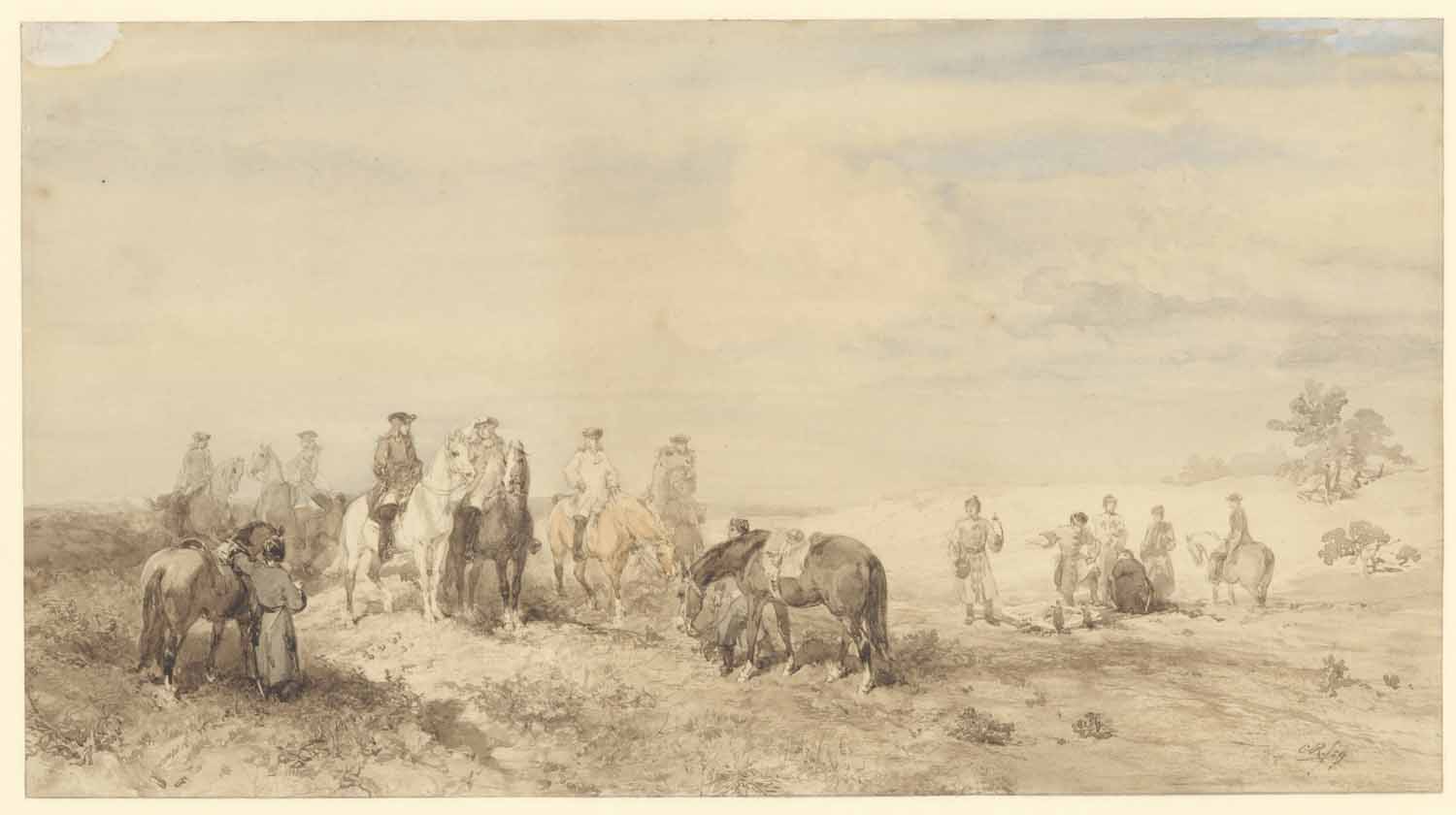 Een ruiter welke zijn paard laat drinken