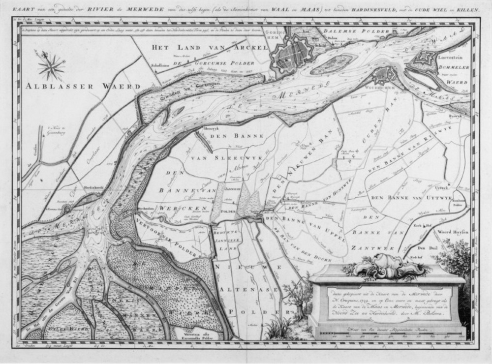 Plattegrond met de rivier de Merwede, kopergravure, ...