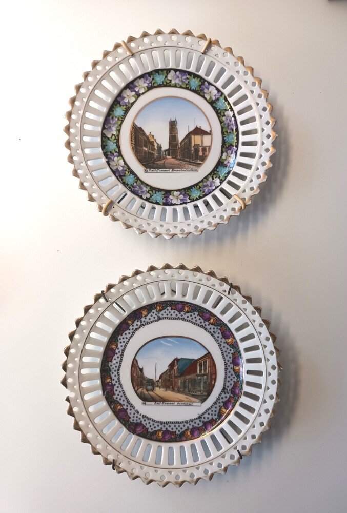 Twee sierbordjes met afbeeldingen van de Nieuwstraat...