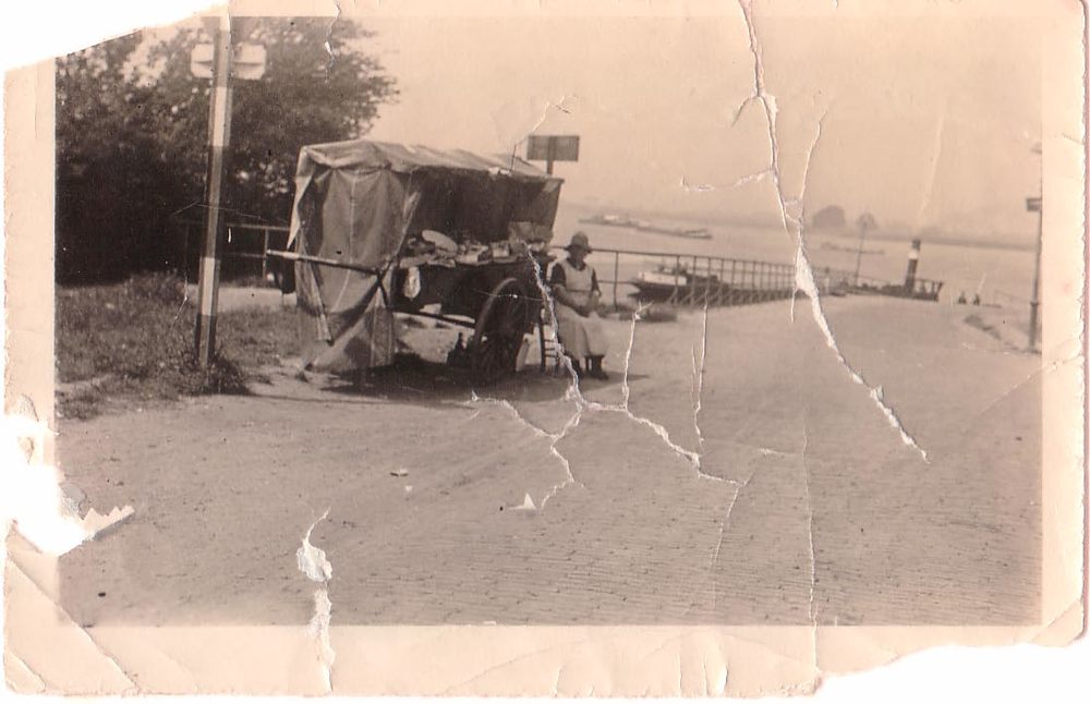 Vrouw met een koopwaren staat bij de veerdam in Zalt...
