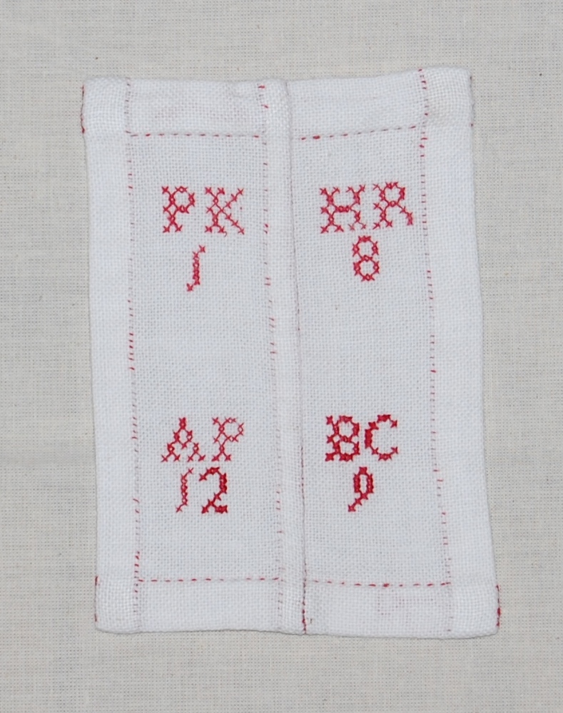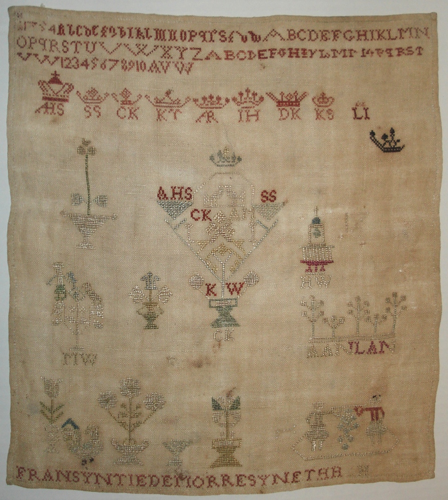 merklap van linnen en zijde met drieletteralfabetten...