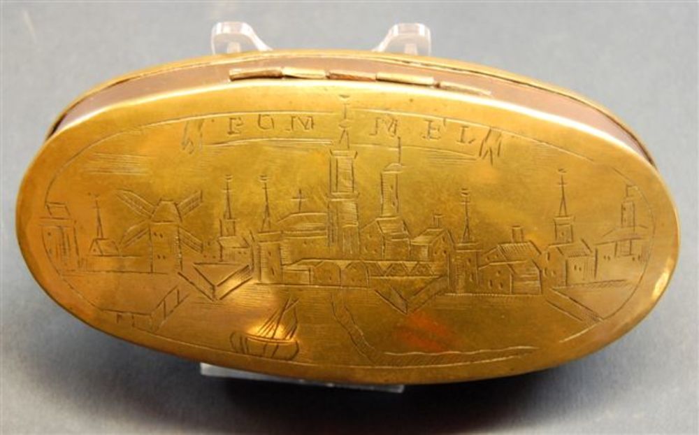 tabaksdoos. Ovaal model van roodkoper en messing met...