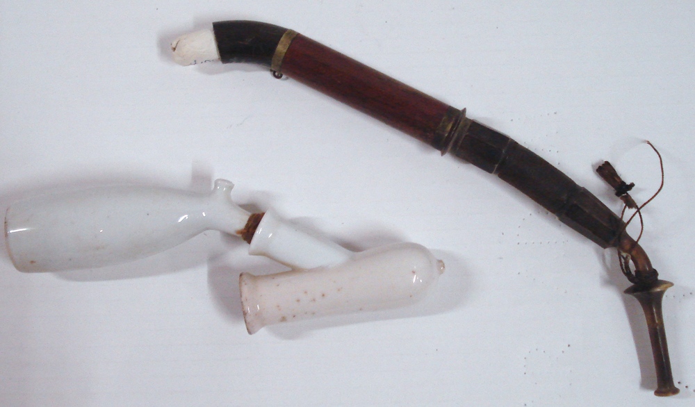 Pijp. Kop, voet, lange steel, koord en houder. Porse...