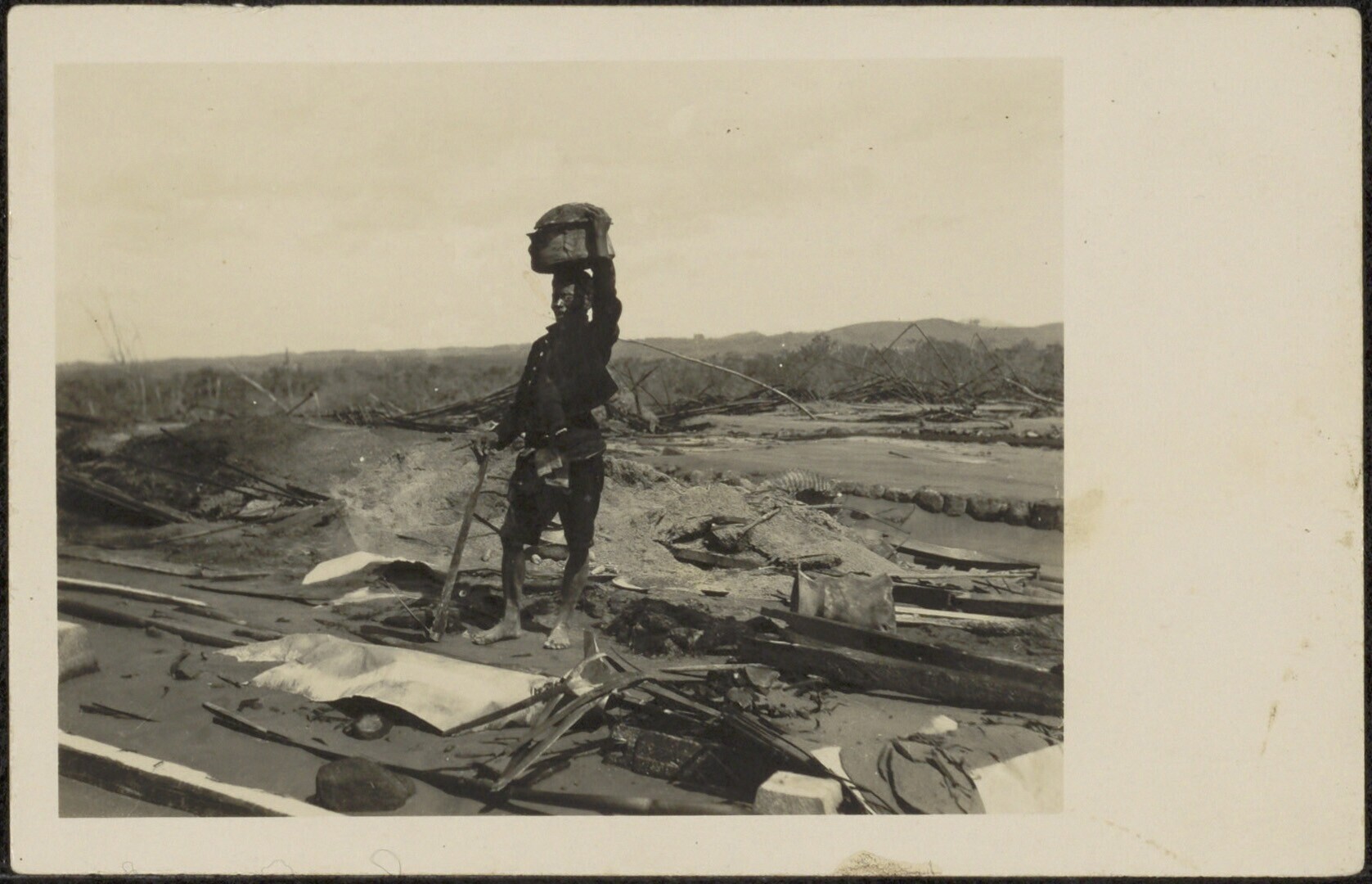 Een man vervoert de resten van zijn door de uitbarst...