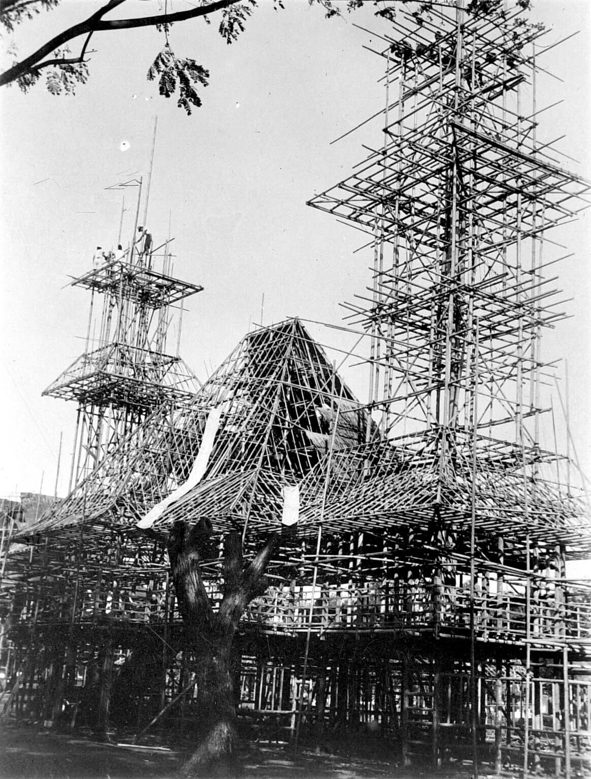 Bamboe-constructies voor de opbouw van de jaarmarkt ...