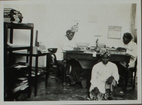 Drie javanen aan het werk in kantoor van suikerfabri...