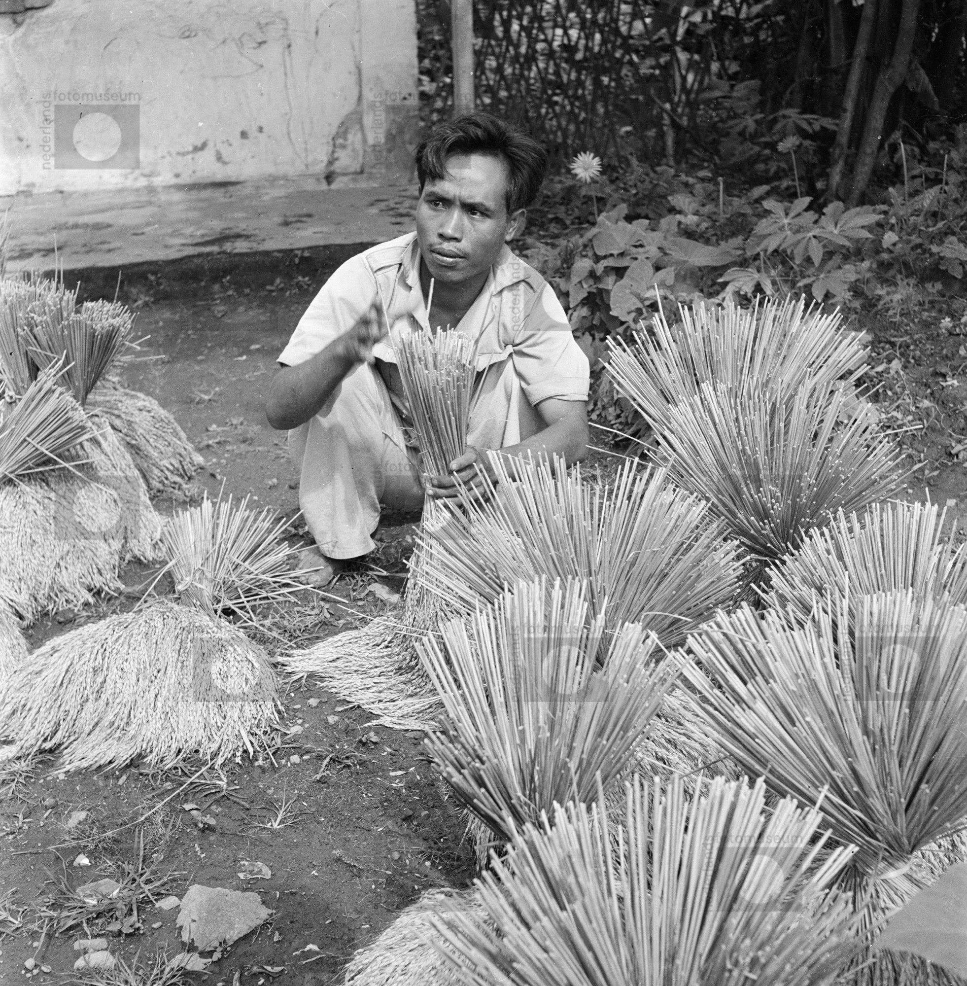 Een man werkt aan bundels rijstaren, die staan te dr...