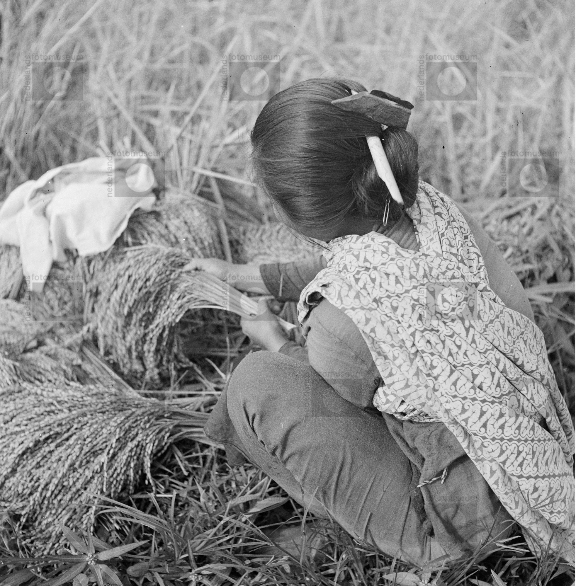 Een meisje oogst rijst in een moerasrijstveld (sawa)...